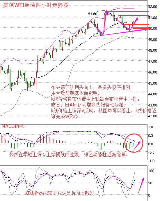 基本面分析: 周四原油價格雖然結(jié)束連續(xù)兩日回調(diào)趨勢,但是盤中美國EIA原油庫存意外大增消息公布后,油價曾一度驟跌,且美國WTI原油價格短線曾一度失守50美元/桶關(guān)口,但是美國原油產(chǎn)量再次下降及近期OPEC采取限產(chǎn)行動預(yù)期的升溫成為多頭的依仗,油價不久便報復(fù)性反抽,收復(fù)日內(nèi)跌幅的同時錄得上漲。 周三,美國能源信息署(EIA)公布的數(shù)據(jù)顯示,截至10月7日當周,美國EIA原油庫存意外大增485萬桶,結(jié)束此前連續(xù)五周下降趨勢,但,美國國內(nèi)原油產(chǎn)量也減少1.7萬桶/日,并已連續(xù)三周錄得下降,降至845萬桶/日產(chǎn)出水平。 美國石油產(chǎn)出的持續(xù)削減無疑將會向市場釋放出積極信號,因為從伊斯坦布爾會晤期間各產(chǎn)油國的表態(tài)當中可以看出,美國石油生產(chǎn)商的參與或也將是OPEC最終落實減產(chǎn)的一大“重要條件”。 另外,中國海關(guān)總署周四(10月13日)公布的數(shù)據(jù)顯示,中國9月份原油進口量為3306萬桶,約為808萬桶/日,同比增長18%。今年9月份中國原油進口量為繼2015年12月份3318萬桶的第二高水平。 原油技術(shù)面分析: 美國WTI原油從四小時走勢圖來看,布林帶三軌拐頭向上,單質(zhì)均線。昨日EIA庫存意外大增,k線價格卻反復(fù)短線拉升,油價上演深V反轉(zhuǎn),刷新日內(nèi)高點。k線價格基本完成W形態(tài)。 附圖MACD指標快線在零軸上方有上穿慢線形成金叉跡象,綠色動能柱縮量;KDJ指標在50下方交叉后向上散發(fā)。 綜合來看,技術(shù)面顯示油價仍有上漲空間,但注意市場消化基本面信息,油價或震蕩下跌,亞盤時段操作上建議低多為主。 美原油操作策略:低多為主。 1、51美元附近進空,止損0.5美元,目標50.1美元附近。 2、建議50.55美元附近做多,止損0.2美元,目標51美元附近。 白銀技術(shù)面分析: 現(xiàn)貨白銀從四小時走勢圖來看,白銀價格比起金價區(qū)間震蕩的更加明顯,布林帶通道逐漸收攏,震蕩幅度也在逐漸變小。附圖MACD指標快慢線走平,紅色動能柱來回縮、放量。 綜合來看,白銀價格上下動能均不足,操作上同樣建議以區(qū)間高拋低吸。 昨日現(xiàn)貨白銀延續(xù)區(qū)間波動,行情早盤先拉升給出17.67的位置后行情遇阻開始回落,最低在美盤給到17.377后整理,最終日線收線在了17.464的位置后,再次以一根射擊之星日線收尾,而這樣的形態(tài)收尾后,今日依舊做高空準備點位上,今日回踩17.6依舊空,止損17.8下方目標看17.3,跌破看17整數(shù)關(guān)口附近。 今日重點關(guān)注: 09:30 中國9月CPI年率 20:30 美國9月零售銷售月率 20:30 美聯(lián)儲主席耶倫講話 22:00 美國10月密歇根大學消費者信心指數(shù)初值 本文作者系CFP注冊理財規(guī)劃師,多年從事金融領(lǐng)域相關(guān)工作,對現(xiàn)貨大宗商品有豐富的實戰(zhàn)經(jīng)驗。 (以上文章由春雨原創(chuàng),轉(zhuǎn)載請注明出處。溫馨提示,投資有風險,入市需謹慎。以上僅代表春雨個人觀點,不作操作依據(jù),據(jù)此操作風險自擔) |