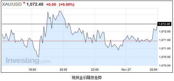 * 美國(guó)市場(chǎng)因感恩節(jié)假期休市 * 中國(guó)10月從香港的黃金進(jìn)口下降至71.58噸 金價(jià)周四在五年低位附近交投,因數(shù)據(jù)鞏固了年內(nèi)升息的預(yù)期后,美元守在多年高位。 另外,歐洲央行官員告訴路透,央行正考慮在下周會(huì)議上推出諸如兩級(jí)存款利率或擴(kuò)大購(gòu)債規(guī)模等選項(xiàng)。消息拖累歐元兌美元走軟,從而重壓以美元計(jì)價(jià)的黃金價(jià)格。 現(xiàn)貨金價(jià)隔夜走勢(shì) 周四北京時(shí)間06:20,現(xiàn)貨金持平在每盎司1,072.46美元,距離上周觸及的2010年2月以來(lái)最低1,064.95美元不遠(yuǎn)。 市場(chǎng)交投清淡,美國(guó)市場(chǎng)因感恩節(jié)假期休市。 “市場(chǎng)的感覺(jué)是美元將繼續(xù)上揚(yáng),因未來(lái)歐洲將繼續(xù)實(shí)施量化寬松(QE)政策,而美國(guó)將升息,”丹麥?zhǔn)氥y行的商品策略部主管Ole Hansen表示。 “市場(chǎng)焦點(diǎn)重回金價(jià)與美元走強(qiáng)之間的反向聯(lián)動(dòng)關(guān)系,這令金價(jià)承壓。” 美元指數(shù)上揚(yáng)0.1%,接近前一日觸及的八個(gè)月高位。 上海金交所黃金溢價(jià)周四在每盎司5-6美元的良性區(qū)間交投,本月初為3-4美元。 周四公布的數(shù)據(jù)顯示,10月中國(guó)大陸從香港的黃金凈進(jìn)口在前月觸及10個(gè)月高位后下降。 現(xiàn)貨銀上揚(yáng)0.6%,報(bào)每盎司14.24美元。現(xiàn)貨鉑金升1.6%,報(bào)每盎司852美元,前一交易日曾觸及七年低位。現(xiàn)貨鈀金上漲0.9%,報(bào)每盎司559美元。 |