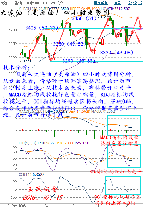 王氏寄語: 千里之行,始于足下,每一次的遠行,是一種新的認知,是一次遇的未知,總有一些行情需要去總結,總有一些地方需要去涉足,或許,這就是常說的讀萬卷書不如行萬里路,行萬里路不如閱人無數吧!無論在哪心卻有牽掛,不管身在何處習慣性看盤,放不下的是情懷,旅行不是放下一切無所謂的遠行,而是心有所念的走向更高。 昨日收盤: 美國WTI原油11月期貨周一(10月17日)收跌0.41美元,或0.81%,報49.94美元/桶。布倫特原油12月期貨周一收跌0.43美元,或0.83%,報51.52美元/桶。石油輸出國組織(OPEC)和俄羅斯高企的原油產量令市場供應過剩擔憂難以減輕,而伊朗的增產態度依然堅決,不過好在美元漲勢暫時受阻以及OPEC成員國的積極言論限制了油價的下行空間。美國WTI原油期貨價格盤中最低觸及49.50美元/桶,布倫特原油期貨價格盤中最高觸及51.17美元/桶。 基本面利好因素: 美聯儲(FED)周一公布的數據顯示,9月工業生產微幅增長,因制造業產出反彈被公用事業產出下降所抵消,表明第三季經濟增長溫和。同時紐約聯儲制造業指數大幅下滑6.8%。巴克萊指出,美國第三季度國內生產總值追蹤增速由2.6%上調至2.7%,因工業生產數據表明工業部門前景大體穩定。不要指望在未來幾個月內出現驚人的增長,平淡趨勢或會持續,因制造業調查中的生產和新訂單指標疲軟。美元指數溫和下滑為油價提供了部分支撐。 原油交易商周五(10月14日)表示,美國Permian油田運往庫欣地區的主要輸油管道依然處于關閉狀態,這導致45萬桶/日的原油運輸遭受影響。此次受到影響的是Permian油田對外最大的輸油管道,該消息導致美國原油期貨即期合約和次月合約價差縮窄,交易員預期一周內庫欣地區庫存至少將因此下降近200萬桶。 美國能源信息署(EIA)公布數據顯示,截至10月7日當周,美國汽油庫存減少190萬桶,市場預估為減少150萬桶。EIA汽油庫存結束連續兩周的增加趨勢,創下9月16日當周以來最大降幅。同時美國精煉油庫存減少370萬桶,市場預估為減少160萬桶,降幅為1月22日當周以來最大。美國原油交割地庫欣庫存減少130萬桶,為6月3日當周以來最大降幅。 OPEC成員國在阿爾及爾達成凍產協議以限制原油供應,為8年以來首次達成凍產協議。OPEC同意將石油產量限制在3250-3300萬桶/日區間。一位消息人士稱,一旦該組織達到其目標,OPEC將向非OPEC產油國尋求支持。此外,OPEC將在11月的下次正式會議上對各成員國的具體產量水準達成協議。 現貨原油技術分析及操作建議—————— 技術分析: 目前從大連油(美原油)四小時走勢圖分析,從盤面來看,價格處于頂部震蕩整理,預計后市行小幅度上漲,從技術面來看,布林帶開口走平,MACD指標均線收攏綠色量柱縮量,KDJ指標均線收攏走平,CCI指標均線超賣區拐頭向上穿破0軸,綜合各指標及盤面分析得出,價格短期震蕩整理上漲,預計后市行情下跌。 大連油操作建議: 今日大連油整體趨勢以逢高做空為主,以低多為輔。 日內阻力 :3410/3450 日內支撐 :3350/3320 激進者空單3410~3420區間內可以考慮擇機入場做空,止損3450上方,目標3350/3320。 穩健者空單3440~3450區間內可以考慮擇機入場做空,止損3480上方,目標3400/3360。 激進者多單3380~3370區間內可以考慮擇機入場做多,止損3340下方,目標3410/3450。 穩健者多單3330~3340區間內可以考慮擇機入場做多,止損3300下方,目標3370/3410。 以上操作建議僅供參考、投資有風險、操作需謹慎。 【以上建議出自中匯天融分析部,以實盤操作建議為準】 美原油操作建議: 今日美原油整體趨勢以逢高做空為主,以低多為輔。 日內阻力 :50.41/51 日內支撐 :49.52/49.08 激進者空單50.41~50.55區間內可以考慮擇機入場做空,止損51上方,目標49.52/49.08。 穩健者空單50.85~51區間內可以考慮擇機入場做空,止損51.44上方,目標50.26/51。 激進者多單49.96~49.82區間內可以考慮擇機入場做多,止損49.37下方,目標50.41~51。 穩健者多單49.22~49.37區間內可以考慮擇機入場做多,止損48.78下方,目標49.82~50.41。 以上操作建議僅供參考、投資有風險、操作需謹慎。 【以上建議出自中匯天融分析部,以實盤操作建議為準】 瀝青方面操作指導: 瀝青屬原油衍生品,行情走勢分析與原油走勢相同,因平臺不同點位各異,有做瀝青需要指導的朋友可以聯系本人。 華益金安天然氣技術分析及操作建議------- 技術分析: 天然氣昨日亞歐盤震蕩走高,美盤受周五日陰線阻力回落之后反彈,日線調整最終收取一根十字星陽線,目前行情來看,天然氣依舊表現強勢,日線走勢跟高位油價一樣處在調整中,周線形態大陽支撐上漲動能依舊存在,周初短期行情來看繼續看調整,今天下方支撐關注凌晨震蕩低點5450附近。 操作建議: 激進者建議5450附近做多,止損在5410,目標看5550和5600. 以上操作建議僅供參考、投資有風險、操作需謹慎。 【以上建議出自中匯天融分析部,以實盤操作建議為準】 現貨白銀技術分析及操作建議-------- 技術分析: 目前從再生銀(現貨白銀)四小時走勢圖分析,從盤面來看,價格長期處于震蕩,今日開盤高開,形成多頭初顯,預計后市行情上漲,從技術面來看,布林帶開口向外擴散,MACD指標均線向上運行發散紅色量柱增加,KDJ指標均線金叉向上運行發散,CCI指標超買區向上運行延伸,綜合各指標及盤面分析得出,價格短期小幅度回落,預計后市行情上漲。 再生銀操作建議: 今日再生銀整體操作趨勢以逢低做多為主,以高空為輔。