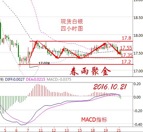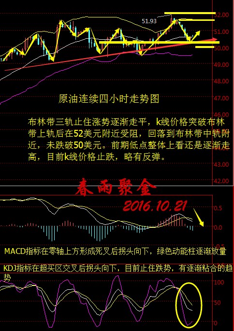 基本面分析: 美國WTI原油11月期貨周四(10月20日)收跌1.17美元,或2.27%,報50.43美元/桶。布倫特原油12月期貨周四收跌1.29美元,或2.45%,報51.38美元/桶。昨日大漲后的獲利了結和日內美元強勢反彈令油價承壓。 美元受到四重利好的強勁支撐,最新一輪辯論中看似沒有任何跡象顯示希拉里陷入困境,大選前景為美元提供支撐。同時美元指數也受到美聯儲內部具有很大影響力官員的鷹派言論受支撐。此外,日內公布的初請和成屋銷售等一系列數據也整體表現不俗,美元走強為油價帶來了下行壓力。 同時,俄羅斯國家石油公司執行長謝琴周四在一個論壇會上表示,俄羅斯作為世界最大的產油國,有能力在未來將石油產出進一步提升,年產能最多可提高2億噸(400萬桶/日)。 美國WTI原油11月期貨于周五(10月21日)凌晨2:30完成最后交易,為避免造成不必要的虧損,投資者做好合約到期準備。 原油技術面分析: 美國WTI原油從四小時走勢圖來看,布林帶三軌止住上漲趨勢逐漸走平。k線價格突破布林帶上軌后,在52美元整數關口受阻回落,由于前期點位強支撐,油價略有小幅反彈。從盤面上看,前期低點不斷上移,k線價格下方支撐較強。附圖MACD指標在零軸上方形成死叉后不斷向下運行,綠色動能柱逐漸放量。KDJ指標未到超賣區止住跌勢,有逐漸粘合趨勢。 綜合來看,原油價格在亞盤時段下方支撐強勁,上漲動能較足,但空間不大,預計晚間原油價格將震蕩下行。 美原油操作策略: 1,回落50美元附近多,止損49.5美元,目標51和51.20美元; 2,反抽51.2空,保守51.3進,止損51.5下方目標看50.4和49.8. 大連再生大連油操作策略: 1,大連油3350~3360區間多,止損30個點,目標3425~3435; 2,大連油3435附近空,止損30個點,目標3385,突破看3345. 白銀技術面分析: 現貨白銀從四小時走勢圖來看,同樣的在經過大幅的回落后直接跌回此前的弱勢震蕩箱體中,并且整體上依舊處于此前的大的震蕩箱體中。從指標來看,布林帶通道小幅的開口后基本走平,附圖MACD指標形成死叉向下運行,綠色動能柱放量。 綜合來看,白銀價格漲幅同樣受限,操作上建議區間操作為主。 昨日現貨白銀市場區間回落,行情回踩17.72的位置后行情開始回來過程,盤中最低給到了本輪17.07連接上來的上行趨勢線支撐點17.4的位置后行情開始整理過程,最終日線收線在了17.513的位置后,日線以一根下影線長于上影線的大陰線收尾而這樣的形態收尾后,今日的行情還需空。 白銀操作策略: 點位上,今日的行情回踩17.6空,止損17.75下方目標看17.4和17.25和17正是古關口。 大連再生銀操作建議: 再生銀3790~3800做空,常規止損,目標看3750和3720. 今日晚間重點關注數據: 22:00 歐元區10月消費者信心指數初值 次日凌晨01:00 美國10月21日當周石油鉆井總數 (以上文章由春雨聚金原創,轉載請注明出處。溫馨提示,投資有風險,入市需謹慎。以上僅代表春雨個人觀點,不作操作依據,據此操作風險自擔) |