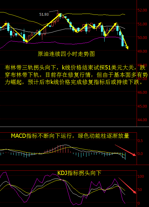 基本面分析: 北京時間周三(10月26日)凌晨4:30,美國石油協會(API)公布的數據顯示,截至10月21日當周,美國API原油庫存意外大增475.4萬桶,至4.719億桶,預期增加80萬桶。庫欣原油庫存減少225.6萬桶,與此同時,API汽油庫存意外大增127.1萬桶。美國WTI原油期貨價格在美國API數據公布后的電子盤交易中短線跳水。 專家預測,對于上周的EIA原油庫存數據來看,減少500多萬桶的數據不會成為常態,所以此次的庫存數據隨著季節因素的變化的情況下,庫存數據可能會有所減少,但預計會差于前值,所以無論最終的數據好于預期還是差于預期,最終都將會是一個利空的數據。 商品經紀公司Powerhouse執行副總裁兼技術分析師David Thompson稱,如果跌穿該水準,美國原油可能很快降至每桶47美元。 原油技術面分析: 從原油連續四小走勢圖來看。布林帶三軌拐頭向下,k線價格前期不斷試探51美元未果,由于API利空,k線價格短線跳水。從盤面上看,k線價格存在修復行情。附圖MACD指標不斷向下運行,綠色動能柱逐漸放量。KDJ指標拐頭向下。 綜合來說,油市空頭勢力逐漸崛起,預計k線價格修復完布林帶缺口后繼續震蕩下行。 美原油操作建議:做多為主 49.5美元附近做空,止損50美元,目標49.50—49.00美元附近 大連再生資源大連油操作建議: 大連油3325~3335區間做空,止損35個點。目標3300~3280 白銀技術面分析: 現貨白銀從四小時走勢圖來看,金價大漲并沒有帶動白銀破位,銀價仍受阻于大箱體頂部17.8~17.9美元區間,并且上方18美元整數關口同樣受阻。從指標來看,布林帶通道小幅開口,料震蕩區間也將適當打開,附圖MACD指標快慢線持續向上運行,紅色動能柱放量。 昨日現貨白銀市場并未能延續前日沖高回來的過程,行情早盤回踩本輪支撐點17.48的位置后行情開始拉升過程,盤中最高觸及到了17.8的位置后行情遇阻本輪回落斐波納契第一壓力線23.6的位置后行情開始整理過程,最終日線收線在了17.73的位置后,日線以一根下影線稍長于上影線的大陽線收尾,而這樣的形態收尾后,日線雖然還未脫離本輪三角整理區間,但回踩逢低多是今日的操作思路點位上, 今日的行情回踩17.6多,止損17.45上方目標看17.8,突破看18證數據關口附近。 大連再生資源再生銀操作建議: 再生銀回踩3780~3790區間做多,止損35個點,目標看3840~3850,突破看3880~3900. 華益金安天然氣,從日線圖來看,昨日天然氣空頭能量非常巨大,高開低走,單邊下跌300多個點,強勢跌破40日均線支撐,今日低開30個點,目前正在向下方60日均線運行,可以說是低開低走,可見空頭能量是多么的巨大,目前已經走出了5連陰,自從K線走出了倒錘頭的反轉信號以來,已經下跌了近700個點,對于倒錘頭這個反轉信號,上引線越長,實體越小,反轉力度就越強,今日需要關注下方5270點支撐,操作上建議維持高空為主。 天然氣操作建議: 5380-5400區間做空,止損40個點,目標5300-5280區間 5270穩健做多,止損40個點,目標5380-5420區間 今日重點關注: 21:45 美國10月Markit綜合PMI初值 22:00 美國9月新屋銷售年化月率 22:30 美國10月21日當周EIA原油庫存 (以上文章由春雨聚金原創,轉載請注明出處。溫馨提示,投資有風險,入市需謹慎。以上僅代表春雨個人觀點,不作操作依據,據此操作風險自擔) |