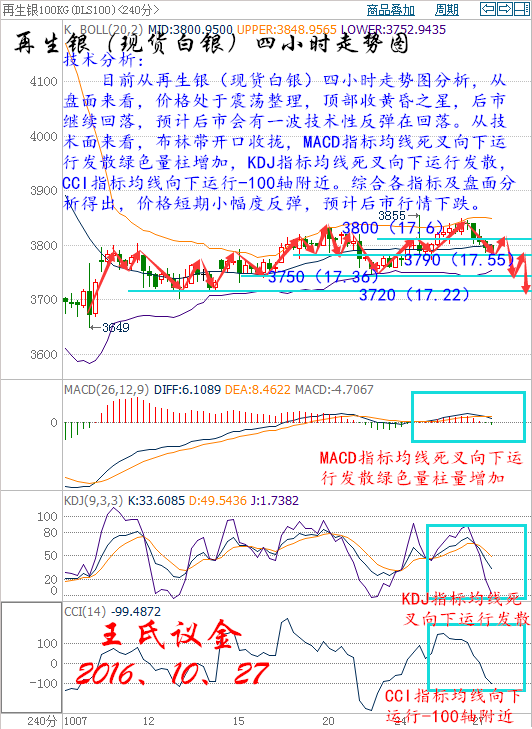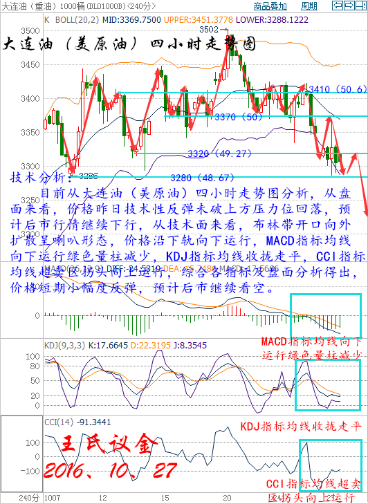 王氏議金:10、27原油、白銀及天然分析EIA,今晚初請白銀如何迎戰? 王氏寄語: 既然如此,并且如果僥幸是故意之為,那么自我欺騙就是明知故犯,曾經一針見血的規律,終究抵不過一次奢望的意外發生。明知故犯的堅持,說明內心不平靜的瞬間?有時候,行情像是表面上的針,不停的轉動,一面轉,一面看著時間匆匆離去,卻無能為力。利潤偶爾像你踮起角尖仍然夠不著的東西。誰都沒有錯是年輕毀了承諾,是魯莽滅了希望! 昨日收盤: 美國WTI原油12月期貨周三(10月26日)收跌0.78美元,或1.56%,報49.18美元/桶。布倫特原油12月期貨周三收跌0.81美元,或1.59%,報49.98美元/桶。雖然美國上周原油庫存意外減少為油價帶來了有效支撐,但近期包括伊拉克在內傳出了石油輸出國組織(OPEC)內部的不和聲音,凸顯出限產協議的不確定性,油價依然承受著較大壓力。美國WTI原油期貨價格盤中最低觸及48.88美元/桶,布倫特原油期貨價格盤中最低觸及49.66美元/桶。 基本面利空因素: 伊拉克石油部長盧艾比(Jabar Ali al-Luaibi)上周日(10月23日)表示,伊拉克應得到石油輸出國組織(OPEC)原油限產協議的豁免,因該國需要收入來打伊斯蘭國戰爭。他認為伊拉克作為OPEC的第二大產油國,應與尼日利亞和利比亞一樣得到豁免,這引起了市場對限產協議的執行力度表示懷疑。 美國油服公司貝克休斯(Baker Hughes)公布數據顯示,截至2016年10月21日當周美國石油活躍鉆井數增加11座至443座,為連續第8周增加,且已經連續17周未錄得減少。美國石油和天然氣活躍鉆井總數增加14座至553座,較去年同期減少234座。 據伊朗通訊社報道,伊朗石油部長稱,新簽訂的合約將幫助伊朗達到原油產量500萬桶/日的目標。今日早些時候,伊朗表示,計劃在今年將原油產量增至400萬桶/日,以期能協同OPEC在11月達成產量協議,支撐國際油價。此外,尼日利亞油長Emmanuel Ibe Kachikwu預期稱,該國原油產量在12月底將增加22%,至220萬桶/日,而利比亞高級石油官員周二(10月18日)表示,利比亞Waha油田上周已經恢復生產,幫助該國原油產量達到58萬桶/日。 OPEC月報顯示,9月OPEC原油產量上升22萬桶/日至3339萬桶/日,8月修正為3317.4萬桶。預計2016年非OPEC原油供應量下降68萬桶/日,但2017年將上升24萬桶/日。預計2017年全球原油供應過剩將從76萬桶增至為80萬桶/日。 俄羅斯能源部數據顯示,俄羅斯9月原油產量較8月增長近4%至1111萬桶/日,創后蘇聯時期紀錄新高。俄羅斯9月原油產量達到4548.3萬噸,8月產量為4530.9萬噸,8月日均產量為1071萬桶。分析師認為如果限產協議要對油價產生實質性影響,類似于俄羅斯等非OPEC產油國的支持也是不可或缺的,因此俄羅斯原油產量再攀新高令油市供應過剩問題恐難得到改善。 美國能源信息署(EIA)周四(10月13日)發布短期月度能源展望報告稱,預計2017年美國原油日均產量將減少14萬桶,至859萬桶。之前預計為按年減少26萬桶。報告暗示全球供需將在2017年第三季開始恢復平衡。同時EIA將2016年美國原油日需求增長預估從之前的20萬桶下調至7萬桶。預計2017年美國原油日需求增長23萬桶,之前的預估為增長14萬桶。 現貨原油技術分析及操作建議———— 技術分析: 目前從大連油(美原油)四小時走勢圖分析,從盤面來看,價格昨日技術性反彈未破上方壓力位回落,預計后市行情繼續下行,從技術面來看,布林帶開口向外擴散呈喇叭形態,價格沿下軌向下運行,MACD指標均線向下運行綠色量柱減少,KDJ指標均線收攏走平,CCI指標均線超賣區拐頭向上運行,綜合各指標及盤面分析得出,價格短期小幅度反彈,預計后市繼續看空。 操作建議: 今日大連油整體趨勢以逢高做空為主,以低多為輔。 日內阻力 :3350/3380 日內支撐 :3280/3220 激進者空單3350~3340區間內可以考慮擇機入場做空,止損3380上方,目標3320/3280。 穩健者空單3370~3380區間內可以考慮擇機入場做空,止損3410上方,目標3350/3320。 激進者多單3280~3290區間內可以考慮擇機入場做多,止損3250下方,目標3320/3350。 穩健者多單3220~3230區間內可以考慮擇機入場做多,止損3190下方,目標3250/3280。 以上操作建議僅供參考、投資有風險、操作需謹慎。 【以上建議出自中匯天融分析部,以實盤操作建議為準】 美原油操作建議: 今日美原油整體趨勢以逢高做空為主,以低多為輔。 日內阻力 :49.71/50.16 日內支撐 :48.67/47.78 激進者空單49.71~49.56區間內可以考慮擇機入場做空,止損50.16上方,目標49.27/48.67。 穩健者空單50~50.16區間內可以考慮擇機入場做空,止損50.6上方,目標49.71/49.27。 激進者多單48.67~48.82區間內可以考慮擇機入場做多,止損48.23下方,目標49.27/49.71。 穩健者多單47.78~47.93區間內可以考慮擇機入場做多,止損47.34下方,目標48.23/47.96。 以上操作建議僅供參考、投資有風險、操作需謹慎。 【以上建議出自中匯天融分析部,以實盤操作建議為準】 瀝青方面操作指導: 瀝青屬原油衍生品,行情走勢分析與原油走勢相同,因平臺不同點位各異,有做瀝青需要指導的朋友可以聯系本人。 華益金安天然氣技術分析及操作建議------- 技術分析: 天然氣亞歐盤前期平穩震蕩,歐盤后段行情開始走低,美盤行情延續單邊下跌達日內最低點5054一線,接近收盤行情反轉收盤5198一線。從指標上分析,日線連續收陰,目前價格承于布林下軌上方附近運行,昨日行情有處于下軌強日線支撐反彈,5日均線指標拐頭下行,短期行情處于整理,日內整體走勢雖然偏向空頭,操作上建