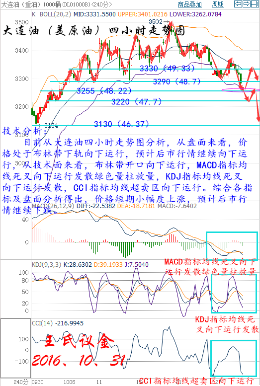 王氏議金:10、31油價首見48美元回升,白銀上方關注17.8美元。 王氏寄語: 沒有到不了的終點,沒有不結束的旅行,開始終將面臨著結束,結束只是為未來更好的開始。千里之上、萬里之外已在返程當中,回到霧霾下、回到喧囂中、回到忙碌的工作習慣了的生活里,回到電腦前K線上陰陽中你我間,讓這新的開始繼續著那份責任與擔當背后的堅持和前進,我帶著你,你帶著錢與信任,遨游在這漲漲跌跌中! 昨日收盤: 美國WTI原油12月期貨周五(10月28日)收跌1.02美元,或2.05%,報48.70美元/桶,本月重挫4.19%,錄得六周來最大單周跌幅。布倫特原油12月期貨周五收跌0.76美元,或1.51%,報49.71美元/桶,本月下跌2.05%。石油輸出國組織(OPEC)在維也納舉行的技術會談最終未能達成任何協議,伊拉克和伊朗對減產的反對態度成為分歧加大的重要原因,限產協議前景蒙上陰影重挫了投資者信心,不過美元回落暫時限制了油價的下行空間。美國WTI原油期貨價格盤中最低觸及48.43美元/桶,布倫特原油期貨價格盤中最低觸及49.33美元/桶。 基本面利好因素: 美國聯邦調查局(FBI)局長James Comey周五(10月28日)在一封信件中表示,FBI將重啟對民主黨候選人希拉里郵件調查,以決定這些郵件是否包含秘密信息。他補充稱,還不清楚這些新材料的重要性。消息人士稱新郵件與維基泄密和克林頓基金無關,也不清楚是否來自希拉里本人,FBI將展開相關調查。目前距離美國總統大選只有10天,華爾街分析師稱此事或有機會影響選舉,消息傳出后美元兌一攬子貨幣一度急跌。美元回落為油價提供了部分支撐。 美國能源信息署(EIA)公布數據顯示,截至10月21日當周,美國原油庫存減少55.3萬桶,連續兩周下滑,至4.6816億桶,市場預估為增加169.9萬桶。同時美國精煉油庫存減少335.4萬桶,為連續五周下滑,市場預估為減少141.3萬桶。美國汽油庫存減少195.6萬桶,創下五周以來最大降幅,市場預估為減少96.3萬桶。而美國原油交割地庫欣庫存也減少134萬桶,連續三周錄得下滑,至5836萬桶。雖然原油庫存降幅不大,但汽油庫存、精煉油庫存以及庫欣原油庫存也全部下滑,這令油價獲得較強利多支撐。 美國油服公司貝克休斯(Baker Hughes)周五(10月28日)公布數據顯示,截至2016年10月28日當周美國石油活躍鉆井數減少2座至441座,今年6月以來首次錄得減少。但美國石油和天然氣活躍鉆井總數依然增加4座至557座,較去年同期減少218座。 OPEC成員國在阿爾及爾達成凍產協議以限制原油供應,為8年以來首次達成凍產協議。OPEC同意將石油產量限制在3250-3300萬桶/日區間。一位消息人士稱,一旦該組織達到其目標,OPEC將向非OPEC產油國尋求支持。此外,OPEC將在11月的下次正式會議上對各成員國的具體產量水準達成協議。 基本面利空因素: 根據Clipperdata公司對OPEC今年1月迄今的原油出口量看追蹤統計顯示,之前OPEC年內出口峰值為2700萬桶/日,而10月下半月開始突然發力,一路攀升至2900萬桶/日,其中貢獻最大的正是沙特,該國最新原油出口創下了840萬桶/日的紀錄新高,真正對原油供求產生影響的是各國的原油出口量而并非原油產量,這是因為各國的原油產量只有通過出口才能在國際市場上參與交易,對供應端產生影響,因此這一數據的走高引起了諸多投資者的擔憂。 石油輸出國組織(OPEC)專家與以俄羅斯為首的非OPEC產油國在維也納舉行的技術會談最終未能達成任何協議,伊朗和伊拉克繼續提出反對意見,這為11月的政策會議前景埋下隱患。市場分析人士指出,OPEC內部的最大分歧就是關于如何分配減產配額,而哪些國家能夠獲得限產豁免權也存在較大爭議。 據伊朗通訊社報道,伊朗石油部長稱,新簽訂的合約將幫助伊朗達到原油產量500萬桶/日的目標。今日早些時候,伊朗表示,計劃在今年將原油產量增至400萬桶/日,以期能協同OPEC在11月達成產量協議,支撐國際油價。此外,尼日利亞油長Emmanuel Ibe Kachikwu預期稱,該國原油產量在12月底將增加22%,至220萬桶/日,而利比亞高級石油官員上周表示,利比亞Waha油田上周已經恢復生產,幫助該國原油產量達到58萬桶/日。 OPEC月報顯示,9月OPEC原油產量上升22萬桶/日至3339萬桶/日,8月修正為3317.4萬桶。預計2016年非OPEC原油供應量下降68萬桶/日,但2017年將上升24萬桶/日。預計2017年全球原油供應過剩將從76萬桶增至為80萬桶/日。 俄羅斯能源部數據顯示,俄羅斯9月原油產量較8月增長近4%至1111萬桶/日,創后蘇聯時期紀錄新高。俄羅斯9月原油產量達到4548.3萬噸,8月產量為4530.9萬噸,8月日均產量為1071萬桶。分析師認為如果限產協議要對油價產生實質性影響,類似于俄羅斯等非OPEC產油國的支持也是不可或缺的,因此俄羅斯原油產量再攀新高令油市供應過剩問題恐難得到改善。 現貨原油技術分析及操作建議———— 技術分析: 目前從大連油(美原油)四小時走勢圖分析,從盤面來看,價格處于布林帶下軌向下運行,預計后市行情繼續向下運行,從技術面來看,布林帶開口向下運行,MACD指標均線死叉向下運行發散綠色量柱放量,KDJ指標均線死叉向下運行發散,CCI指標均線超賣區向下運行。綜合各指標及盤面分析得出,價格短期小幅度上漲,預計后市行情繼續下跌。 操作建議: 今日大連油整體趨勢以逢高做空為主,以低多為輔。 日內阻力 :3290/3330 日內支撐 :3220/3180 激進者空單3290~3300區間內可以考慮擇機入場做空,止損3330上方,目標3255/3220。 穩健者空3330~3340單區間內可以
