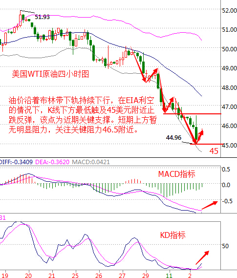 基本面分析: 周三(11月2日)美國WTI原油12月期貨收跌1.33美元,或2.85%,報45.34美元/桶,盤中最低觸及44.98美元/桶。布倫特原油1月期貨收跌1.28美元,或2.66%,報46.86美元/桶,盤中最低觸及46.48美元/桶。EIA原油庫存創(chuàng)歷史最高記錄,重挫油價,盤中一度重挫逾3%,不過尾盤時段小幅反彈收復部分跌幅。 美國能源信息署(EIA)周三(10月2日)公布數據顯示,美國10月28日當周EIA原油庫存大增1442萬桶,汽油庫存減少220.7萬桶,精煉油庫存減少182.8萬桶。其中原油庫存錄得34年來數據編制以來最高水平。 美聯(lián)儲維持聯(lián)邦基金利率目標在0.25-0.50%不變,并表示升息的理據“持續(xù)增強”。這表明,美聯(lián)儲在12月中今年最后一次貨幣政策會議上加息的門檻看來已經很低了。盡管美聯(lián)儲會議聲明如此鷹派,但美元并沒有給出多大反應,持續(xù)在低位徘徊,低位震蕩的美元給油價提供了部分支撐。 ----------春雨聚金美原油技術分析與操作策略 原油的話近期的話不用說下跌肯定是大勢所趨,不管是凍產的前景不明,還是各主要產油國產量繼續(xù)增加。還是昨日的API和EIA的大超預期的利空,導致油價是一跌再跌。但是要值得關注的是昨天EIA數據出來后油價是出現了一波較大的反抽之后再狂跌的,并且沒有跌破45美元的支撐,到45美元附近觸底反彈。截止發(fā)文時間,油價已經反彈至EIA數據公布前的46美元附近。因為明天是大數據非農,油價是否能“咸魚翻身”成敗就在此一戰(zhàn)了。 原油技術面分析: 美國WTI原油從四小時走勢圖來看,油價沿著布林帶下軌持續(xù)下行,在EIA大幅利空的情況下,K線下方最低觸及45美元下方不得企穩(wěn),并止跌反彈,該點可作為近期關鍵支撐。短期內上方暫無明顯阻力,關鍵阻力關注46.5美元附近。 從指標來看,布林帶通道大幅向下運行,但下軌有所走緩;附圖MACD指標快線拐頭向上有上穿慢線形成金叉跡象,綠色動能柱縮量;KD指標超賣區(qū)形成金叉向上發(fā)散。 從指標來看,大跌之后的小幅反彈,所有指標均已開始向多頭趨勢發(fā)展,均顯示油價有反彈需求,不排除這是一次觸底反彈,操作上可以嘗試抄底,建議輕倉做多。反彈至阻力位附近可做空。 美原油操作建議: 策略1:45.3美元多單進場,盈利目標45.8美元止損0.2美元 策略2:46.2美元空單進場,盈利目標45.5美元止損0.2美元 白銀技術面分析: 現貨白銀從四小時走勢圖來看,走勢基本與黃金價格一致,上方同樣達成昨日晚間給出的18.7美元目標,下方回落至18.45美元附近反彈,形成支撐,上方18.7附近仍有小級別阻力,日內關鍵阻力看向18.8美元附近。 從指標來看,布林帶通道大幅開口向上,附圖KD指標在超買區(qū)形成死叉向下發(fā)散。綜合來看,預計白銀價格走勢與黃金價格一致。操作上建議回落做多為主。 白銀操作建議: 1、18.45美元附近做多,目標看向18.7美元上方,止損0.15美元。 2、18.65-18.7美元區(qū)間空,止損18.85,目標18.4和18.3美元 今日重點關注: 09:45 中國 10月財新服務業(yè)PMI 20:00 英國 11月央行基準利率(%) 20:30 美國 10月29日當周初請失業(yè)金數(萬) 20:30 美國 第三季非農生產力初值(%) 21:45 美國 10月Markit服務業(yè)PMI終值 22:00 美國 9月耐用品訂單月率終值(%) 22:00 美國 10月ISM非制造業(yè)PMI (以上文章由春雨聚金原創(chuàng),轉載請注明出處。溫馨提示,投資有風險,入市需謹慎。以上僅代表春雨個人觀點,不作操作依據,據此操作風險自擔) 本文作者系CFP注冊理財規(guī)劃師,多年從事金融領域相關工作,對現貨大宗商品有豐富的實戰(zhàn)經驗。 |