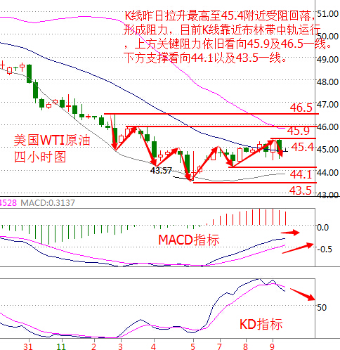 基本面分析: 周二(11月8日)美國(guó)WTI原油12月期貨收漲0.09美元,或0.20%,報(bào)44.98美元/桶,最高觸及45.39美元/桶。布倫特原油1月期貨收跌0.11美元,或0.24%,報(bào)46.04美元/桶。 美國(guó)大選投票已正式開始,預(yù)計(jì)將在周三(11月9日)12時(shí)左右將揭曉終極懸念。市場(chǎng)廣泛預(yù)計(jì)民主黨候選人希拉里勝選的幾率較大。據(jù)Slate雜志根據(jù)提前投票數(shù)據(jù)做出的非官方預(yù)測(cè):希拉里在影響選舉結(jié)果數(shù)個(gè)關(guān)鍵州中的佛羅里達(dá)州、俄亥俄州和內(nèi)華達(dá)州取得領(lǐng)先。市場(chǎng)風(fēng)險(xiǎn)情緒改善,美元指數(shù)刷新一周高位至97.02。美元走強(qiáng)令油價(jià)承壓。 北京時(shí)間周三(11月9日)凌晨5:30,美國(guó)石油協(xié)會(huì)(API)公布的數(shù)據(jù)顯示,截至11月4日當(dāng)周,美國(guó)API原油庫(kù)存大增440萬(wàn)桶,預(yù)期增加105萬(wàn)桶。庫(kù)欣原油庫(kù)存增加20萬(wàn)桶,與此同時(shí),API汽油庫(kù)存減少360萬(wàn)桶。美國(guó)WTI原油期貨價(jià)格在美國(guó)API數(shù)據(jù)公布后的電子盤交易中小幅下跌。 美國(guó)能源資料協(xié)會(huì)(EIA)將在周三晚間23:30公布其庫(kù)存報(bào)告。分析師預(yù)估上周美國(guó)原油庫(kù)存將增加130萬(wàn)桶。 原油技術(shù)面分析: 美國(guó)WTI原油從四小時(shí)走勢(shì)圖來(lái)看,原油價(jià)格昨日拉升最高至45.4附近受阻回落,形成阻力,目前K線靠近布林帶中軌運(yùn)行,上方關(guān)鍵阻力看向45.9及46.5一線,下方關(guān)鍵支撐看向44.1以及43.5一線。 從指標(biāo)來(lái)看,布林帶通道收口走平,附圖MACD指標(biāo)快慢線緩慢上行,但紅色動(dòng)能柱縮量;KD指標(biāo)靠近超買區(qū)形成死叉向下發(fā)散。 綜合來(lái)看,油價(jià)在經(jīng)過(guò)兩日的上漲后出現(xiàn)下調(diào)跡象,預(yù)計(jì)日內(nèi)油價(jià)將震蕩偏下行,操作上建議反彈做空。 今日原油操作建議:反彈做空 1、45.4美元附近做空,目標(biāo)看向44.1美元附近,止損0.4美元; 2、下方44美元附近可嘗試做多,目標(biāo)看向45美元上方,止損0.3美元。 白銀技術(shù)面分析: 現(xiàn)貨白銀從四小時(shí)走勢(shì)圖來(lái)看,白銀價(jià)格同樣有較大的波動(dòng)附圖,昨日大幅沖高后又直線回落,給出了上方明確的阻力位18.73美元附近,相比起金價(jià),銀價(jià)更為偏多頭,上方可能進(jìn)一步看向19美元附近,下方則關(guān)注18美元一線,進(jìn)一步關(guān)注17.55美元附近。 白銀價(jià)格走勢(shì)圖 從指標(biāo)來(lái)看,布林帶通道收口走平,附圖KDJ指標(biāo)三線交叉向下運(yùn)行。綜合來(lái)看,白銀價(jià)格下行概率較高,同樣因美國(guó)大選不確定性,投資者應(yīng)順應(yīng)美國(guó)大選投票結(jié)果做單。 現(xiàn)貨白銀操作建議: 回踩18.6空,止損18.8下方目標(biāo)看17.97,跌破看17.75的爭(zhēng)奪,跌破的話空單中期持有。 今日關(guān)注重點(diǎn): 09:30 中國(guó)10月CPI 17:30 英國(guó)9月貿(mào)易帳 23:00 美國(guó)9月批發(fā)銷售月率 23:30 美國(guó)11月4日當(dāng)周EIA原油庫(kù)存變動(dòng) (以上文章由春雨聚金原創(chuàng),轉(zhuǎn)載請(qǐng)注明出處。溫馨提示,投資有風(fēng)險(xiǎn),入市需謹(jǐn)慎。以上僅代表春雨個(gè)人觀點(diǎn),不作操作依據(jù),據(jù)此操作風(fēng)險(xiǎn)自擔(dān)) 本文作者系CFP注冊(cè)理財(cái)規(guī)劃師,多年從事金融領(lǐng)域相關(guān)工作,對(duì)現(xiàn)貨大宗商品有豐富的實(shí)戰(zhàn)經(jīng)驗(yàn)。微信:chunyujujin,QQ:148115584 |
