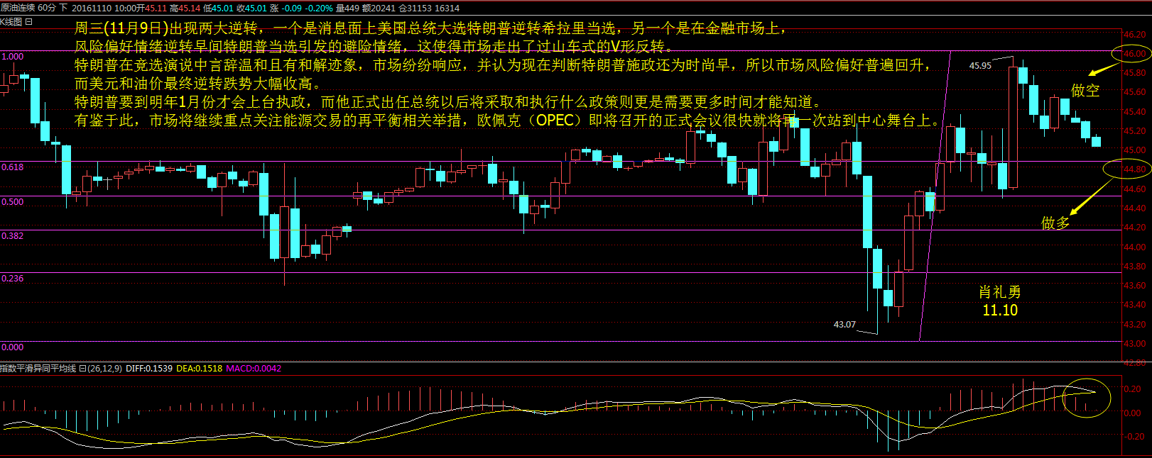 肖禮勇:11.10早間美原油/寧貴瀝青行情分析 技術面,日線級別,K線運行于布林中下軌之間,布林帶開口擴大,附圖MACD指標0軸上方死叉運行,綠色能量柱開始縮量,KD指標在超賣區金叉運行;四小時走勢圖來看,布林帶開口開始擴大,MACD指標在零軸下方金叉運行,紅色動能柱放量。操作上建議以回落做多為主思路。(重點關注46美元關口) 美原油操作建議: 回踩0.618和44.80一線做多,止損默認。目標看45.50-45.80一線。 第一次達到46美元可以輕倉做空,止損默認。目標看45美元。 |