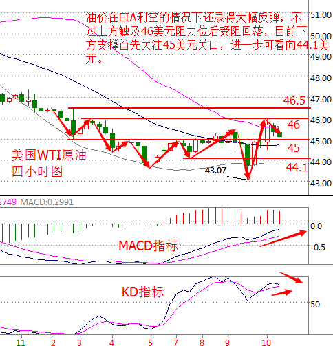 基本面分析: 周三(11月9日)美國WTI原油12月期貨收漲0.29美元,或0.64%,報45.27美元/桶,最高觸及45.95美元/桶。布倫特原油1月期貨周三收漲0.32美元,或0.70%,報46.36美元/桶,最低觸及46.95美元/桶。 市場在經歷了美國總統大選和美國原油庫存報告的雙重考驗后開始企穩。特朗普意外獲勝一度令包括原油在內的諸多資產承壓重挫,但隨著風險情緒的逐漸穩定,原油價格逐漸收復失地并暫時上漲。 美國能源信息署(EIA)公布數據顯示,截至11月4日當周,美國原油庫存增加243.2萬桶,美國精煉油庫存減少194.8萬桶,為連續第七周錄得減少。美國汽油庫存減少284.1萬桶。 EIA原油庫存公布之后,油價在半小時之內的反應較為平淡,沒有出現較大的波動,不過在后半夜油價大幅發力,雖然原油庫存大增,但精煉油及汽油庫存大減刺激原油多頭,在后半夜甚至拉升至接近46美元關口。 原油技術面分析: 美國WTI原油從四小時走勢圖來看,油價在EIA利空的情況下還能錄得大幅反彈,不過上方受阻于46美元阻力位回落,目前下方支撐首先需要關注45美元關口,破位可能看向44.1美元附近。 從指標來看,布林帶通道走平,附圖MACD指標快慢線持續向上運行,不過紅色動能柱縮量;KD指標K值出現拐頭。 綜合來看,技術面上油價有回落需求,操作上建議亞盤時段可嘗試短線操作空單,觸及支撐位可考慮做多。 今日原油操作建議: 46美元下方做空,目標看向45美元附近,止損0.3美元; 45美元下方做多,目標看向46美元附近,止損0.3美元。 白銀技術面分析: 現貨白銀從四小時走勢圖來看,同樣白銀價格基本確定近期頂部,上方19美元為頂,下方18美元為短期關鍵支撐,白銀回落觸及18.34后反彈,同時該位置處于布林帶中軌,日內需要關注中軌附近支撐,上方阻力可關注18.74美元附近。 從指標來看,布林帶通道開口走平,附圖KD指標死叉向下發散,不過有所走緩。綜合來看,白銀價格回調已基本到位,早間底部基本已確定在18.4美元附近,操作上建議回落做多。 今日重點關注: 17:00 IEA將公布月度原油市場報告。 17:00 意大利9月季調后工業產出月率(%) 22:15 2016年FOMC票委、圣路易斯聯儲主席布拉德將陳述經濟和貨幣政策。 21:30 加拿大9月新屋價格指數月率(%) 21:30 美國11月5日當初請失業金人數(萬) (以上文章由春雨聚金原創,轉載請注明出處。溫馨提示,投資有風險,入市需謹慎。以上僅代表春雨個人觀點,不作操作依據,據此操作風險自擔) 本文作者系CFP注冊理財規劃師,多年從事金融領域相關工作,對現貨大宗商品有豐富的實戰經驗。 |
