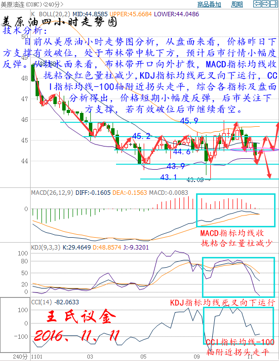 王氏議金:11、11OPEC限產(chǎn)前景令人擔(dān)憂 原油白銀收官震蕩 王氏寄語: 一群人喧鬧我負(fù)責(zé)微笑,不太大喜也不太大悲,一年也僅此一次,不被雙11打亂節(jié)奏。進(jìn)能傾聽搶購殺價聲,退能思考交易下單聲,有人狂掃廉價貨,有人卻賺翻倍錢。人們總是一邊憧憬著理想美好的生活,一邊爭搶著現(xiàn)實匱乏的面包。來來往往忙于爭搶,推推搡搡互不相讓,有人深夜不眠只為守那跟風(fēng)潮,有人半夜不睡只為博那順勢單。 昨日收盤: 美國WTI原油12月期貨周四(11月10日)收跌0.61美元,或1.35%,報44.66美元/桶。布倫特原油1月期貨周四收跌0.52美元,或1.12%,報45.84美元/桶。美國大選塵埃落定后市場焦點重新轉(zhuǎn)向石油輸出國組織(OPEC)的限產(chǎn)前景,由于當(dāng)前供應(yīng)過剩局面依然嚴(yán)峻,投資者普遍對11月30日的維也納會談不抱太高期望。美國WTI原油期貨價格盤中最低觸及44.44美元/桶,布倫特原油期貨價格盤中最低觸及45.70美元/桶。 基本面利好因素: 能源情報監(jiān)測機構(gòu)Genscape的數(shù)據(jù)顯示,本周美國原油主要交割地庫欣地區(qū)庫存下降近66.4萬桶,這為油價提供了部分支撐。 美國能源信息署(EIA)公布數(shù)據(jù)顯示,截至11月4日當(dāng)周,美國精煉油庫存減少194.8萬桶,市場預(yù)估為減少214.4萬桶,為連續(xù)第七周錄得減少。美國汽油庫存減少284.1萬桶,市場預(yù)估為減少102.5萬桶。此外,上周美國原油進(jìn)口減少155.9萬桶/日,至744.2萬桶/日。而煉廠產(chǎn)能利用率上升1.9個百分點,至87.1%。 OPEC成員國在阿爾及爾達(dá)成凍產(chǎn)協(xié)議以限制原油供應(yīng),為8年以來首次達(dá)成凍產(chǎn)協(xié)議。OPEC同意將石油產(chǎn)量限制在3250-3300萬桶/日區(qū)間。一位消息人士稱,一旦該組織達(dá)到其目標(biāo),OPEC將向非OPEC產(chǎn)油國尋求支持。此外,OPEC將在11月的下次正式會議上對各成員國的具體產(chǎn)量水準(zhǔn)達(dá)成協(xié)議。 基本面利空因素: 全球市場依然沉浸在美國共和黨候選人特朗普意外獲勝之后的大逆轉(zhuǎn)行情之中,美元指數(shù)一舉突破99關(guān)口,升至兩周高位99.081,為兩周以來的最高水平。之前24小時隨著特朗普贏得美國大選,全球市場上演過山車式行情,風(fēng)險資產(chǎn)遭遇沉重拋壓,之后又完全逆轉(zhuǎn)跌勢。同時美國初請數(shù)據(jù)表現(xiàn)靚麗,進(jìn)一步推高了年底的加息期望,美元走強令油價承壓。 國際能源署(IEA)最新月報顯示,如果石油輸出國組織(OPEC)不減產(chǎn),2017年的油市有可能還會維持供應(yīng)過剩局面,因全球產(chǎn)油商都在加速供應(yīng)而需求增長下滑。10月全球供應(yīng)增長80萬桶/日至9780萬桶/日,受到OPEC創(chuàng)紀(jì)錄高產(chǎn)及俄羅斯、巴西、加拿大和哈薩克斯坦等非OPEC國家產(chǎn)油量增長提振。IEA維持預(yù)測2016年需求增幅為每日120萬桶,且預(yù)期明年的需求增幅將保持同速,較2015年所及的五年峰值180萬桶/日逐步減慢。 隨著特朗普最終贏得美國大選,石油輸出國組織(OPEC)計劃的限產(chǎn)行動面臨著更加艱巨的挑戰(zhàn),在全球經(jīng)濟形勢不確定性增加和原油需求疲軟的大環(huán)境下,OPEC想要推高油價就必須付出更多的努力。特朗普之前曾表示將重振美國原油行業(yè),計劃批準(zhǔn)更多聯(lián)邦屬地和水域的化石燃料開采項目,這有助于美國原油產(chǎn)量的進(jìn)一步提升,從而增加了OPEC減產(chǎn)行動的困難性。 美國能源信息署(EIA)周三(11月9日)公布的數(shù)據(jù)顯示,截至11月4日當(dāng)周,美國原油庫存增加243.2萬桶,4.85億桶,增幅0.5%,這小于之前美國石油學(xué)會(API)公布的440萬桶的增幅,市場預(yù)估為增加133萬桶。此前EIA原油庫存增幅創(chuàng)歷史紀(jì)錄新高。美國原油交割地庫欣庫存增加2.8萬桶,至5848萬桶,連續(xù)第二周小幅增加。此次EIA報告中最大的利空信息是美國原油產(chǎn)量,上周美國國內(nèi)原油產(chǎn)量增加17萬桶至869.2萬桶/日,為2015年5月來最大增幅,觸及6個月來最高水平。 美國油服公司貝克休斯(Baker Hughes)周五(11月4日)公布數(shù)據(jù)顯示,截至2016年11月4日當(dāng)周美國石油活躍鉆井?dāng)?shù)增加9座至450座,觸及2月份以來最高水平,過去23周內(nèi)有20周錄得增加。截至11月4日當(dāng)周美國石油和天然氣活躍鉆井總數(shù)增加12座至569座,較去年同期減少202座。 現(xiàn)貨原油技術(shù)分析及操作建議———— 技術(shù)分析: 目前從美原油小時走勢圖分析,從盤面來看,價格昨日下方支撐有效破位,處于布林帶中軌下方,預(yù)計后市行情小幅度反彈。從技術(shù)面來看,布林帶開口向外擴散,MACD指標(biāo)均線收攏粘合紅色量柱減少,KDJ指標(biāo)均線死叉向下運行,CCI指標(biāo)均線-100軸附近拐頭走平,綜合各指標(biāo)及盤面分析得出,價格短期小幅度反彈,后市關(guān)注下方支撐,若有效破位后市繼續(xù)看空。 美原油操作建議: 今日美原油整體趨勢以逢低做多為主,以高空為輔。 穩(wěn)健者多單44.4美元附近可以考慮進(jìn)場做多,止損0.3美元,目標(biāo)45.7美元激進(jìn)者多單45美元附近考慮進(jìn)場做多,止損0.3美元,目標(biāo)46美元。 穩(wěn)健者空單45.80美元附近考慮進(jìn)場做空,止損0.3美元,目標(biāo)44.5美元。 激進(jìn)者空單46美元附近可以考慮進(jìn)場做空,止損0.3美元,目標(biāo)45美元