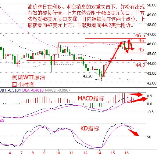 基本面分析: 周三(11月16日)美國WTI原油12月期貨收跌0.24美元,或0.52%,報45.57美元/桶,盤中最高觸及46.41美元/桶。布倫特原油1月期貨周三收跌0.32美元,或0.68%,報46.63美元/桶,最高至47.56美元/桶。 雖然石油輸出國組織(OPEC)正在積極協調各成員國之間的分歧,并展現出積極的限產跡象,但美國上周原油庫存的再度大增依然令油價承壓,同時美元的持續走高也令油價下行風險進一步加大。 OPEC消息人士周三表示,OPEC官員正努力制訂限制產量協議的細節,縮小部分成員之間分歧,展現出落實8年來首個限產協議的積極跡象。限產協議關鍵之一,是伊朗的產量水平。伊朗期望其產量維持在400萬桶/日,但其他OPEC成員認為其產量應該維持在370萬桶/日。這個問題令到10月28日高層會議一度膠著。 俄羅斯能源部長諾瓦克今日也發表講話稱,俄羅斯已經做好配合OPEC限產行動的準備,認為OPEC有很大可能達成協議,這鼓舞了多頭信心,油市一度出現瘋狂買入的跡象,為油價提供了有效支撐。 原油技術面分析: 美國WTI原油從四小時走勢圖來看,油價昨日在利多、利空消息的雙重夾擊下,并沒有出現有效的破位行情,上方依然受阻于46.5美元關口,下方依然受45美元關口支撐,日內繼續關注這兩個點位,上破就看向47美元上方,下破就看向44.2美元附近。 從指標來看,K線觸及布林帶上軌后回落,布林帶開口走平,附圖MACD指標快慢線向上運行,快線出現走平跡象,紅色動能柱縮量;KD指標高位死叉向下發散。 綜合來看,技術面上油價仍偏空頭,亞盤時段可以短線反彈空單操作。 今日美原油操作建議:反彈做空 1、46美元下方做空,目標看向45美元附近,破位繼續持有晚間看向44.2美元,止損46.5美元附近; 2、44.5~45美元區間做多,目標看向46美元附近,破位繼續看向46.5美元,止損44.2美元附近。 白銀技術面分析: 現貨白銀從四小時走勢圖來看,白銀價格震蕩區間相對更大,上方阻力關注17.23美元,下方關注16.8美元,近期也需要關注這兩個點位的破位情況,有效破位的意思就是指破位之后還能夠企穩,并不只是留下一條上影線。 從指標來看,布林帶通道收口向下,K線震蕩于中、下軌之間,附圖KD指標死叉向下發散,但K值走緩。 綜合來看,預計白銀價格同樣的維持區間震蕩,操作上建議在區間內高拋低吸。 白銀操作建議: 今日的行情回踩17.1空,止損17.3,下方目標看上周低點16.6,跌破的話止損跟進本錢持有看16.3和16. 今日重點關注: 17:30 英國10月季調后零售銷售月、年率(%) 18:00 歐元區10月CPI年率(%) 21:30 美國10月未季調CPI年率終值(%) 21:30 美國11月12日當周初請失業金人數(萬) 21:30 美國11月5日當周營建許可月率(%) 21:30 美國10月實際收入月率(%) 23:00 美聯儲主席耶倫發表關于經濟前景展望的證詞 (以上文章由春雨聚金原創,轉載請注明出處。溫馨提示,投資有風險,入市需謹慎。以上僅代表春雨個人觀點,不作操作依據,據此操作風險自擔) |