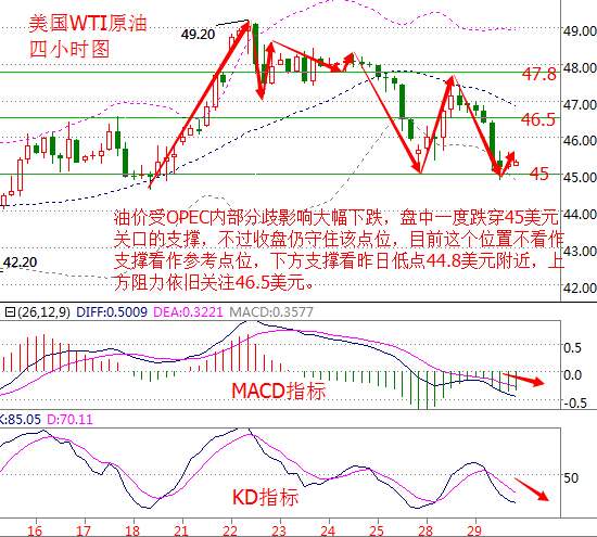 基本面分析: 美國WTI原油1月期貨周二(11月29日)收跌1.85美元,或3.93%,報(bào)45.23美元/桶,盤中最低觸及44.82美元/桶。布倫特原油1月期貨周二收跌1.86美元,或3.86%,報(bào)46.38美元/桶,盤中最低觸及46.92美元/桶。因隔夜消息顯示,OPEC會(huì)議前夕產(chǎn)油國內(nèi)部存在較大分歧,且多個(gè)產(chǎn)油國不愿意在OPEC內(nèi)部分歧解決之前參加今晚的OPEC會(huì)議。 OPEC各成員國石油部長將于周三在維也納舉行政策會(huì)議,計(jì)劃將該組織原油產(chǎn)量削減100萬桶/日,10月份其原油產(chǎn)量為3382萬桶/日。不過伊朗和伊拉克依然保持強(qiáng)硬立場,這令OPEC達(dá)成協(xié)議的難度增加。并且,沙特要求伊朗與伊拉克均參與減產(chǎn)計(jì)劃,而伊朗則要求沙特獨(dú)自承擔(dān)所有減產(chǎn)負(fù)擔(dān)。顯然,明日產(chǎn)油國需要克服這一巨大溝壑。 此外,凌晨美國石油協(xié)會(huì)(API)公布的數(shù)據(jù)顯示,截至11月25日當(dāng)周,美國原油庫存減少71.7萬桶,至4.876億桶,分析師預(yù)估為增加63.6萬桶。庫欣原油庫存增加240萬桶,為2015年3月以來最大增幅。 原油技術(shù)面分析: 美國WTI原油從四小時(shí)走勢圖來看,油價(jià)受OPEC內(nèi)部分歧影響大幅下挫,盤中一度跌穿45美元,不過收盤仍守住該點(diǎn)位,目前這個(gè)位置不當(dāng)支撐可看作參考點(diǎn)位,下方支撐看昨日低點(diǎn)44.8美元附近,破位繼續(xù)看向44.2美元附近,上方阻力依舊關(guān)注46.5美元。 從指標(biāo)來看,K線跌破布林帶下軌后反彈重回下軌上方,附圖MACD指標(biāo)快慢線持續(xù)向下運(yùn)行,綠色動(dòng)能柱縮量;KD指標(biāo)持續(xù)向下運(yùn)行,不過目前出現(xiàn)小幅度的拐頭跡象。 綜合來看,油價(jià)依舊還有下行動(dòng)能,考慮到今天OPEC會(huì)議,技術(shù)面方面已無法判斷油價(jià)走勢,今天的油價(jià)走勢基本上是一句話一個(gè)行情,操作上可暫時(shí)以區(qū)間操作,OPEC會(huì)議前離場,并在OPEC會(huì)議結(jié)果出爐后順勢做單,預(yù)計(jì)這樣的利潤是非常可觀的。 原油日間操作策略: 1、建議上方見46美元做空,止損默認(rèn),目標(biāo)45.3美元附近 2、下方見45美元做多,默認(rèn)止損,目標(biāo)45.6若不破區(qū)間,策略美盤前有效。數(shù)據(jù)較多,多關(guān)注消息面。 白銀技術(shù)面分析: 現(xiàn)貨白銀從四小時(shí)走勢圖來看,白銀價(jià)格昨日跳水跌穿了16.5美元的支撐,不過下方觸及16.4美元位置后大幅反彈,目前16.4~16.5美元這個(gè)區(qū)間為下方的關(guān)鍵支撐,上方阻力依舊看向前日高點(diǎn)16.85美元區(qū)間,進(jìn)一步看向17美元關(guān)口。 從指標(biāo)來看,K線跌破布林帶中軌后反彈目前運(yùn)行在中、上軌之間,附圖KD指標(biāo)形成金叉向上運(yùn)行。 綜合來看,盡管技術(shù)面顯示白銀價(jià)格有反彈動(dòng)能,但從近期走勢分析來看預(yù)計(jì)仍會(huì)是個(gè)大區(qū)間的震蕩行情,操作上建議區(qū)間操作。 現(xiàn)貨白銀操作建議: 今日的行情如果先回落給出16.42多,止損16.3上方目標(biāo)看16.7附近,上方今日給出16.8附近準(zhǔn)備空。 (以上文章由春雨聚金原創(chuàng),轉(zhuǎn)載請注明出處。溫馨提示,投資有風(fēng)險(xiǎn),入市需謹(jǐn)慎。以上僅代表春雨個(gè)人觀點(diǎn),不作操作依據(jù),據(jù)此操作風(fēng)險(xiǎn)自擔(dān)) 本文作者系CFP注冊理財(cái)規(guī)劃師,多年從事金融領(lǐng)域相關(guān)工作,對現(xiàn)貨大宗商品有豐富的實(shí)戰(zhàn)經(jīng)驗(yàn)。 |