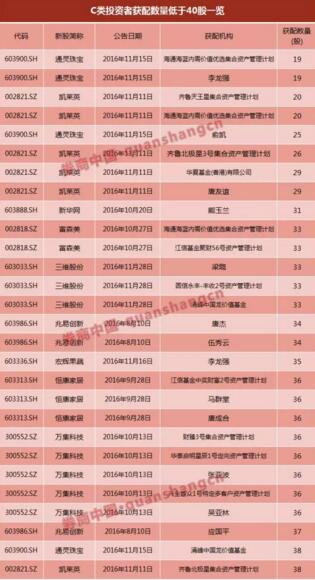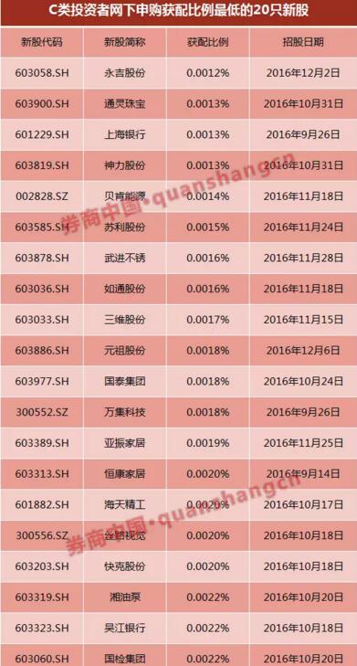 本文來源:券商中國 作者:桂衍民 曉霞 曾穎 都說打新造富,可是網上申購的,不斷抱怨根本就申購不到,而今就連憑高市值參與網下配售的個人投資者也不淡定了。 這個有著43638名個人投資者參與的網下配售市場,配售比例卻不及社保類或公募類投資者的十分之一,其中最高配售比相差竟然高達43倍。既然都是網下配售的參與者,配售比例卻為何有如此大的差距? 值得一提的是,個人投資者已占網下投資者總數的94.17%,成為網下新股申購的絕對主力。而這部分投資者持有的股票市值已高達2.4萬億。 這個超級不均衡的配售比例惹得個人投資者一路傷心,那么先來說說什么叫配售比例,也即配售比?配售比就是網下新股發行中,網下投資者最終配售量與其對應的有效申購量的比值。 C類投資者網下配售比不斷創新低 先來復習下A、B、C三類投資者的定義: 根據當前證券市場相關法律法規,保薦機構及承銷商通常把參與網下申購的投資者分為三類,并根據各自所屬類型進行不同比例的配售。其中,通過公開募集方式設立的證券投資基金和社保基金投資管理人管理的社會保障基金(簡稱“A類”或“社保類”);根據《企業年金基金管理辦法》設立的企業年金基金和符合《保險資金運用管理暫行辦法》等相關規定的保險資金(以下簡稱“B類”或“公募類”);除A類和B類以外的其他投資者(“C類”或“推薦類”)。 據券商中國記者統計,截至12月20日,今年以來共發行225只新股。其中,58只新股因為首發規模不超過3000萬股,直接網上定價發行,未對網下進行發行;167只新股網上網下同時發行,截至今日,其中的161只新股已完成了網下申購。 以個人投資者為主的C類(又名推薦類)投資者,即使頂格申購,161只新股的平均配售比也僅為0.0081%。而對應的A類投資者和B類投資者平均配售比分別達到了0.0166%和0.0153%。也就是說,在新股網下市場,數量龐大的C類投資者,平均配售比遠遠不及A類投資者和B類投資者。 如果這還不夠明顯,我們不妨再看看單只新股網下申購中不同投資者的配售比情況:161只已出網下配售結果的新股中,B類投資者獲配比與C類投資者獲配比,最高值出現在凱萊英網下發行中,該值已經達到了43倍。 凱萊英網下發行配售結果顯示,該股C類投資者最終的配售比例為0.0029%,B類投資者最終的配售比例為0.1274%,A類投資者最終的配售比例亦為0.1274%。 如果這還不夠明顯,我們不妨再看看單只新股網下申購中不同投資者的配售比情況:161只已出網下配售結果的新股中,最高比值出現在新股上海銀行網下發行中,上海銀行網下發行結果顯示,A類投資者、B類投資者和C類投資者最終的配售比分別為0.1034%、0.0432%和0.0013%,A類與C類的比值為79.54倍,B類與C類的比值為32.71倍。 在上述161只新股中,C類投資者配售比絕對值最低的為永吉股份,為0.0012%,最高的為華安證券,為0.1044%。C類投資者配售比絕對值低于0.01%的有128只;C類投資者配售比絕對值在0.01%至0.1%之間的新股有33只;C類投資者配售比絕對值達到或超過0.1%的有且僅有一只,即華安證券。 而結合發行時間來看,網下新股的配售比基本與參與投資者數量反比,在投資者參與數逐步走高的同時,配售比呈現逐步走低的態勢。 券商中國記者按C類投資者配售比進行月度統計顯示:11月份為0.0188%,10月份為0.004%,9月份為0.0039%,8月份為0.0054%,7月份為0.0051%,6月份為0.006%,5月份為0.0079%,4月份為0.0082%,3月份為 0.0097%,2月份為0.0121%,1月份為0.0096%。 不僅如此,隨著配售比的屢創新低,C類投資者頂格申購后最終獲配絕對量也屢次出現奇葩量。根據券商中國記者統計,上述161只新股中,最終獲配新股絕對量最少的為19股,在通靈珠寶的IPO發行中,就有兩位C類的個人投資者僅獲得19股。 不僅如此,在161只新股中,這些C類投資者頂格申購后僅獲得20股、25股、29股、33股等情況比比皆是。 券商中國記者統計數據發現,上述161只新股最終的網下獲配投資者中,單只新股最終獲配絕對量低于100股的高達1550次,涉及49只新股。 巨大配售比差背后三大誘因 由于今年以來,新股發行無論網上還是網下,實行的都是“先申購后繳款”,在新股不敗、新股掛牌上市后不斷漲停的背景下,配售比的巨大差異,對應的其實就是網下新股申購收益的巨大差異。 對于當前C類投資者配售比和絕對獲配量持續走低,深圳一家IPO項目較多的券商投行發行人員表示,主要是僧多、粥少、惜賣三個原因所致。 中證協最新數據顯示,目前獲得網下新股詢價資格的投資者一共46342個,推薦類也就是C類投資者就高達45910個,A類和B類投資者合計才432個。而數量龐大的C類投資者中,個人投資者又以43638人的絕對數量成為主力,推薦類機構投資者才區區2272家。這也就是說,當前網下新股發行市場中,個人投資者以43638人,或占比網下投資者數量94.17%的比例成為絕對主力。 但與此相對應的,新股在進行網下配售時,對C類投資者的獲配份額卻不增反降。券商中國記者統計顯示,上述161只新股中,最終的網下新股份額按類分配占比中,C類平均才34.62%,B類平均為17.65%,A類平均為46.89%。 單只新股中,C類投資者獲得份額占比最低的為凱萊英,才2.61%。C類投資者獲得份額占比低于10%的有9只,10%-20%的有15只,20%-30%有31只,30%以上的有107只。 說白了,主要的就是僧多粥少。上述發行人員介紹,粥少有兩方面:一是啟動網下向網上回撥后,很多新股網下和網上發行數量占