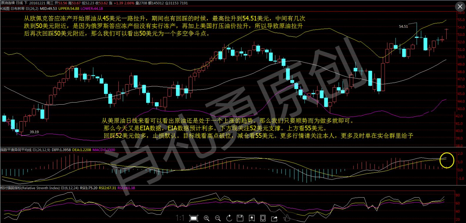 肖禮勇:12.21晚間EIA利多寧貴瀝青.原油繼續看多 消息面: 美元隔日攀升至14年高位,因美聯儲主席耶倫有關就業市場的講話,鞏固了美國明年升息較預期更快的觀點。耶倫周一稱,美國就業市場處于近十年來最佳狀態,暗示薪資增長正在加快。金價隔日走低,受累于美元攀升,投資者因預期全球經濟增長加速和美國升息而賣出黃金。而土耳其和德國發生的襲擊事件未能提振對黃金的避險需求。 油價隔日上漲,但結算價低于日高,因之前利比亞宣布重開封鎖兩年的西部油田輸油管。利比亞國家石油公司稱西部油田輸油管封鎖兩年后已經重開,料未來三月產量增加27萬桶/日后,油價從高位回落。盤后,美國石油協會API公布數據現實,12月16日當周美國原油庫存大幅下降逾400萬桶,油價漲幅擴大。本周二,WTI原油2月期貨收于52.23美元/桶,漲幅0.21%;布油2月期貨收于55.35美元/桶,漲幅0.78%。因利比亞宣布油田重啟,美布兩油分別自盤中高點回落。而在周三凌晨,由于API數據一片利好,油價短線上漲。 |