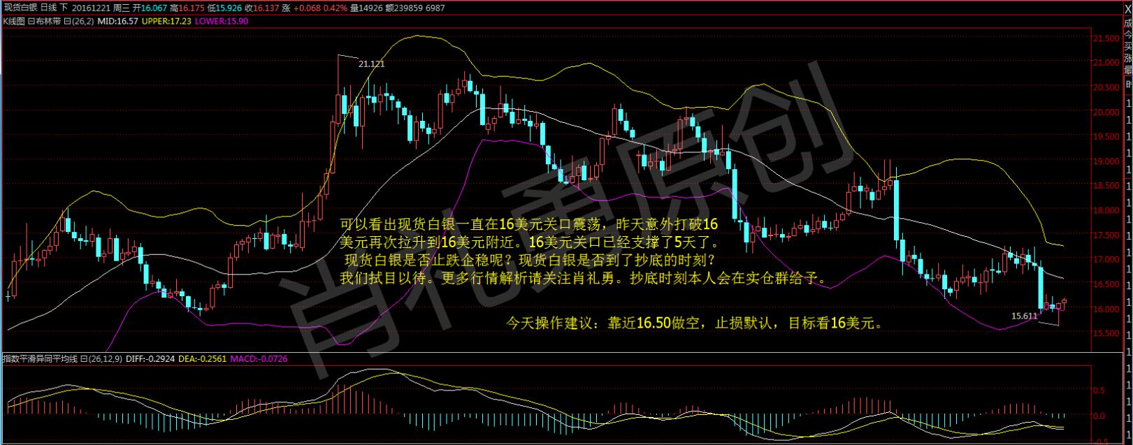 肖禮勇:12.21寧貴白銀.現貨白銀是否進入止跌時刻? 消息面: 自加息后行情的波幅就從大海的洶涌變成了湖泊樣的慢幅度的擴散,昨日日本央行公布利率決議,繼續維持按兵不動貨幣政策,并上調經濟發展預期,但日央行行長黑田東彥在隨后講話中表示,通脹表現依然低迷,目前談縮減政策為時過早。對于目前的市場來說,加息后就只有兩個信號看漲看跌,不過就目前來看美指因為消息的拉伸對黃金的下行空間并不是很大,基本上都是一波趨勢后就開始修正,特別是美國節假日即將來臨,交投相對來說就清淡了許多。 同時需要提到的是周二(12月20日)因市場預期全球經濟增長加速以及美國升息,提振美元攀升,且美國股市再度創下紀錄新高,投資者繼續拋售黃金,此前土耳其和德國發生的襲擊事件未能提振對黃金的避險需求。分析師警告稱,盡管短期金價的超賣跡象可能引發修正反彈,但整個拋售浪潮恐怕遠未結束。 寧貴白銀: 貴金屬方面在美聯儲加息之后就一直處于空頭格局,短線的反彈并不影響大的行情趨勢,不要因為短期的幾個交易日的反抽就認定了黃金白銀的底部的確認,事件的影響對于貴金屬而言從來沒有一步到位的說法,相信還有進一步的下跌空間回被創造出來。 技術面上,白銀4小時呈下降通道,BOLL中軌附近承壓,15分鐘圖破位下軌打開下跌空間操作上建議逢反彈做空為主。 |