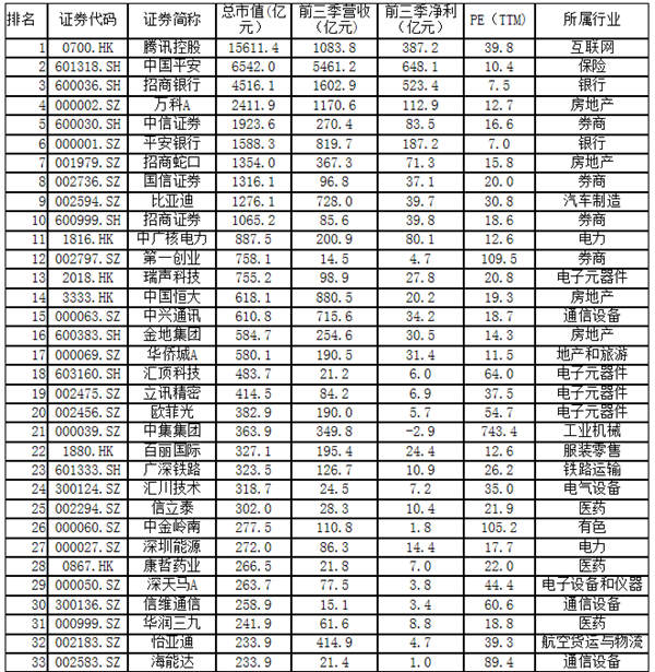 深圳是中國GDP第四大城市,公認的四個一線城市之一,近年來深圳在產(chǎn)業(yè)轉(zhuǎn)型的道路廣受贊譽,是國內(nèi)通過科技創(chuàng)新實現(xiàn)產(chǎn)業(yè)升級的模范城市。 深圳擁有全國兩個證券交易所之一的深交所,科技創(chuàng)新與金融資本在這里完美結(jié)合。深圳是全國的金融重鎮(zhèn),截至2016年10月末,深圳市本外幣存款額高達6.7萬億元,僅次于北京和上海,位居國內(nèi)第三位;中國平安保險、招..商銀行、平安銀行、中信證券、國信證券、招商證券等金融機構(gòu)扎根深圳發(fā)展壯大;華為、騰訊、中興、比亞迪等自主創(chuàng)新企業(yè)已經(jīng)具備了全球競爭力。上市公司是優(yōu)秀企業(yè)的代表,通過對深圳市上市公司市值50強的分析可以窺見深圳城市的競爭力,也可以給中國經(jīng)濟轉(zhuǎn)型給予借鑒。 總市值超5萬億 全國第三 深圳市上市公司市值50強的上市公司總市值達5.1萬億元,上市地點是滬深交易所和香港聯(lián)交所,從行業(yè)分布來看主要集中在金融、房地產(chǎn)、互聯(lián)網(wǎng)、電子元器件、醫(yī)藥等行業(yè),上市公司總市值也是位居國內(nèi)第三位。 在本次統(tǒng)計中,我們未將借殼鼎泰新材的順豐快遞計算在內(nèi)。按照目前股價計算,順豐市值超過2000億;另外自主創(chuàng)新的世界500強公司華為并未上市,也無法統(tǒng)計;當(dāng)然,這次統(tǒng)計包含了今年9月份將注冊地遷到深圳的恒大地產(chǎn),其市值超過600億。 整體看來,深圳市上市公司50強具有以下特點: 一、互聯(lián)網(wǎng)騰訊一家獨大 排名第一騰訊控股,市值高達1.56萬億,超過了中國石油和工商銀行,與阿里巴巴市值不分伯仲,二者交替問鼎市值第一寶座。 騰訊代表中國互聯(lián)網(wǎng)公司在全球也享有聲譽,是全球社交網(wǎng)絡(luò)巨頭,其產(chǎn)品QQ及微信,對中國互聯(lián)網(wǎng)用戶實現(xiàn)了全覆蓋。騰訊通過社交起步,目前已成為綜合的互聯(lián)網(wǎng)服務(wù)提供商,騰訊目前是國內(nèi)最大的游戲運營開發(fā)商,國內(nèi)前三的互聯(lián)網(wǎng)廣告服務(wù)商,同時也入股了京東、滴滴等。 排名50強里也僅有騰訊一家互聯(lián)網(wǎng)公司,其占50強市值比重30%,是排名第二的中國平安的市值2倍以上。與之相對的是,北京市互聯(lián)網(wǎng)企業(yè)梯隊建設(shè)得比較好,百度、京東、攜程、新浪微博等均名列前茅。 二、金融市值占比超三成,招商局系基因強大 深圳的金融企業(yè)均是市場化發(fā)展起來的,股權(quán)較分散,比如中國平安、招商銀行、中信證券、國信證券、招商證券、第一創(chuàng)業(yè)證券等,市值前12名有7家是金融類企業(yè),總市值高達1.77萬億,占50強市值比重近35%。 中國平安和招商銀行均是深圳走出的世界500強企業(yè)。中國平安是國內(nèi)市值最大的保險企業(yè)。值得注意的是中國平安、招商銀行、招商證券以及地產(chǎn)股招商蛇口,這些公司在發(fā)展過程中都有招商局的基因,央企招商局對深圳金融、地產(chǎn)業(yè)務(wù)貢獻巨大。深圳強大的金融企業(yè)對深圳實體經(jīng)濟的發(fā)展貢獻良多。 三、地產(chǎn)雙巨頭會師深圳,雙雙進入世界500強 中國地產(chǎn)公司萬科和恒大歷史性攜手進入世界500強。今年9月,從廣州起家的恒大地產(chǎn)也將注冊地遷往深圳。 深圳是中國地產(chǎn)行業(yè)的標(biāo)桿,除了一直引領(lǐng)行業(yè)發(fā)展的萬科,還有招商地產(chǎn)、華僑城、金地集團等。深圳市值50強中地產(chǎn)企業(yè)市值近6000億元,市值占比12%左右。深圳還有一大批本土地產(chǎn)企業(yè)比如寶能、京基、卓越、榮超、鴻榮源、中洲、聯(lián)泰等,這些公司在深圳有大量土地儲備,在目前深圳高房價背景下,地產(chǎn)二線梯隊資本實力也不容小覷。 四、消費電子全球重鎮(zhèn),全球硬件硅谷 深圳之于中國,恰如班加羅爾之于印度,硅谷之于美國。深圳是全球硬件的硅谷,全球消費電子產(chǎn)業(yè)鏈配套最好的城市。 華為、中興領(lǐng)銜的深圳電子高端制造業(yè)已經(jīng)站在了全球的前沿。一批高端制造企業(yè)成為細分行業(yè)的全球龍頭,如聲學(xué)龍頭瑞聲科技。圍繞著智能手機產(chǎn)業(yè)鏈,一批配套企業(yè)成長起來,大族激光、歐菲光、匯頂科技、立訊精密、信維通信、長盈精密、匯川技術(shù)等等。這些企業(yè)雖然在深圳市值50強中總市值占比不高,但數(shù)量最多,這才是深圳產(chǎn)業(yè)升級的主力軍。 五、汽車、制藥等多點開花 深圳可圈可點的企業(yè)還有很多,比如新能源汽車制造商比亞迪。比亞迪從電池起步,成長為國內(nèi)新能源電動汽車的領(lǐng)軍企業(yè),還涉足軌道交通業(yè)務(wù),公司還得到了股神巴菲特的青睞,比亞迪目前市值1276億元位列深圳50強的第9名。 制藥企業(yè)在50強中也有五席之地,信立泰、康哲藥業(yè)、華潤三九、國藥一致、海普瑞市值均超過200億元,是國內(nèi)醫(yī)藥企業(yè)的中堅力量。 從大亞灣核電站為基礎(chǔ)起家的中廣核電力是核電行業(yè)的國家隊,作為清潔能源的代表,目前市值887億元。 女鞋龍頭百麗國際,受行業(yè)不景氣影響,市值從高峰期的超過千億,回落到目前的327億。集裝箱全球龍頭中集集團目前市值363億元。深圳的企業(yè)依托制度優(yōu)勢,在細分行業(yè