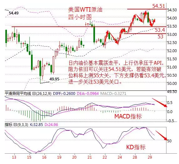 肖禮勇:12.29寧貴瀝青.美原油晚間行情分析 消息面: 今日國際油價承壓于API原油庫存大增,今天周四(12月29日)亞市盤中,國際油價小幅下跌,美國WTI原油在開盤走低至53.46美元后震蕩走高,不過仍小幅下跌。隔夜API原油庫存大增420萬桶,油價承壓。 行情回顧及展望——目前2017年將至,減產協議也將正式執行,從目前各產油國態度來說,減產協議將會被遵守,預計油價后續會進一步上漲。 技術面: 美國WTI原油從四小時走勢圖來看,日內油價基本震蕩走平,上行仍承壓于API,阻力依舊可以關注54.51美元,若能有效破位料將上測55大關,下方支撐保存完好仍關注53.4以及53美元兩個支撐。 原油價格走勢圖 從指標來看,K線震蕩于布林帶中軌上方,布林帶通道向上運行,附圖MACD指標快慢線出現死叉向下緩慢運行,綠色動能柱開始冒頭放量;KD指標死叉向下延伸,不過目前有所走緩。 綜合來看,油價目前技術面偏弱性,基本面上也支撐不足,短線上預計油價仍是上漲無力,將震蕩走平偏下行,不過個人看好回落反抽,操作上建議回落做多為主。 操作建議:回落做多 53美元附近做多,目標看向54美元上方,止損在52.6美元下方; 靠近54.5美元做空,目標看0.7美元左右,止損0.2美元。 |