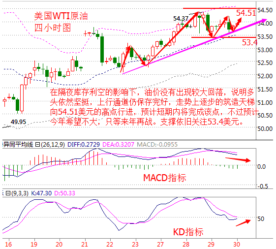 今天是這個市場在2016年的最后一天了,在2016年這長大戲中,開場很低調,中間有低谷,有高.潮,而現在是一個結尾了,而結尾則需要我們協同合作共同演繹一出完美的謝幕大戲。各位投資者就是其中的一個個鮮活的演員,我們或者各自為戰,或者有一個小團體奮戰,到底誰能笑到最后呢? 基本面分析: 周五(12月30日)美國公布了EIA數據顯示,“反轉王”甘愿屈服,原油庫存意外大增,油價承壓小幅走軟,年內油價走勢就這么定了?NO,不到最后一刻,我們絕不能放棄,周六的鉆井數據有望再次引發海嘯。 兩大原油庫存炸翻油價,減產能否助原油上漲? EIA公布,截至12月23日當周,美國原油庫存增加61.4萬桶,至4.961億桶,增幅0.1%,連續第二周上升,市場預估為減少150萬桶。上周美國原油進口減少34.7萬桶,至816.7萬桶/日。美國精煉油庫存減少188.1萬桶,市場預估為增加183.3萬桶,連續兩周錄得下滑。美國上周汽油庫存減少159.3萬桶,市場預估為增加150萬桶,為7周以來最大降幅。美國原油交割地庫欣庫存增加17.2萬桶。 北京時間00:17,現貨黃金白銀行情出現跳漲,一分鐘COMEX最活躍的主力2月黃金期貨合約成交量達5678手,價值逾7億美金買盤令現貨黃金短線上漲逾4美元。隨后,漲勢擴大至逾10美元,漲幅逾1.4%。黃金多頭強力拉升,就在2016年結束的前兩天發起攻勢,有望實現三年來首次年度收漲。除了美元美股周四跌幅較大外,21:30公布的當周初請失業金人數也起到了至關重要的作用。 在特朗普贏得美國大選的后兩周,美國初請失業金的累計升幅已激增至3.5萬。而且,如今自特朗普勝選后,續請失業金人數累計增幅超過6%,而周四公布的續請失業金人數增幅更是創下2009年五月以來最大。 原油技術面分析: 美國WTI原油從四小時走勢圖來看,在隔夜庫存利空的影響下,油價沒有出現較大回落,說明多頭依然堅挺,上行通道仍保存完好,走勢上逐步筑造天梯向54.51美元的高點行進,預計短期內將完成該點,不過預計今年希望不大,只等來年再戰。支撐依舊關注53.4美元。 從指標來看,布林帶通道緩慢上行,K線回落至中軌上方反彈,附圖MACD指標快慢線死叉下行,綠色動能柱微幅放量;KD指標出現拐頭跡象。 綜合來看,短期內油價有回落需求,早盤時段預計油價會有所回落,日內筆者看好觸底反抽,操作上建議反彈做空。 今日美原油操作建議:反彈做空 54美元附近做空,目標看向53.5美元附近,止損在54.2美元上方; 初次觸及53.4美元入場做多,目標看向54.5美元附近,止損在53美元下方。 白銀技術面分析: 現貨白銀從四小時走勢圖來看,白銀價格在金價突破阻力的情況下沒能實時跟上,但走勢上來說16.25美元這個阻力也將破位,進一步阻力仍需要關注16.4美元,支撐可關注16美元關口,進一步看15.8美元。 從指標來看,K線震蕩上行靠近布林帶上軌,附圖KD指標持續上行。 綜合來看,白銀價格反彈動能較足,目前需要等待金價大漲帶動銀價破位,操作上可以長線做多。 現貨白銀操作建議: 16美元附近做多,目標看向16.5美元附近,止損在15.8美元下方; 初次觸及16.4美元做空,目標看向16.2美元附近,止損在16.5美元。 今日重要關注數據: 16:00 西班牙 12月CPI年率初值 17:00 意大利 11月PPI年率 22:45 美國 12月芝加哥PMI 23:30 美國 截至12月23日當周ECRI領先指標 英國股市提前至北京時間20:30休市。 德國股市提前至北京時間21:00休市。 次日凌晨2:00 美國石油鉆井數 。ㄒ陨衔恼掠纱河昃劢鹪瓌,轉載請注明出處。溫馨提示,投資有風險,入市需謹慎。以上僅代表春雨個人觀點,不作操作依據,據此操作風險自擔) 更多行情分析指導請聯系本人微信:chunyujujin |