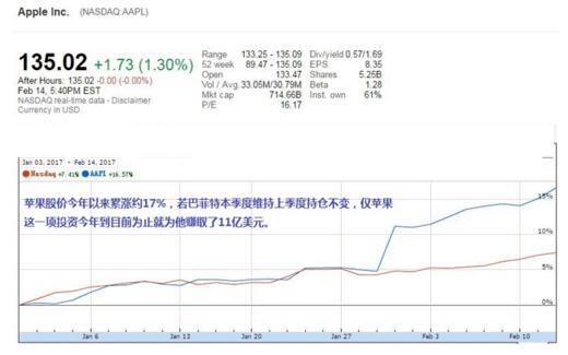 本周蘋果已連續(xù)第二個交易日創(chuàng)收盤新高,分析師仍然看好蘋果后市表現(xiàn)。 華爾街見聞昨日文章提到,本周一瑞銀發(fā)布報告稱市場低估了蘋果服務的市場價值,該司股價至少有10%的上漲空間。高盛則將蘋果的目標價格上調(diào)至150美元/股,基于增強現(xiàn)實(AR)的革命性技術應用,對iPhone 8的銷量有信心。 蘋果最新財報顯示,去年第四季度出售iPhone7829萬部,單季銷量高于分析師預期和去年同期,而且實現(xiàn)了一年來首次季度銷量同比增長。這一成績反映了iPhone 7上市后首個完整季度的業(yè)績,是在智能手機全球需求放緩、相對低價安卓手機充斥的大環(huán)境下取得的成績,讓投資者對iPhone前景持樂觀態(tài)度,成為本輪蘋果股價走高的直接動力。 除了iPhone 7業(yè)績增長,四季度蘋果的服務業(yè)務也表現(xiàn)不俗。得益于Pokemon Go和Super Mario Run等游戲的流行和訂閱帶來的收入增加,包括App Store、Apple Pay和iCloud在內(nèi)的蘋果服務業(yè)務收入增長18.4%,達71.7億美元。 而在蘋果去年走出股價低谷以前,巴菲特就已經(jīng)布局并加碼押注蘋果。 2015年7月至2016年5月,蘋果股價累跌30%。但在去年5月傳出同年第一季度巴菲特豪擲11億美元建倉蘋果的消息后,蘋果股價開始企穩(wěn)。去年第二季度巴菲特大幅增持蘋果,持倉較一季度末增長55%。蘋果股價去年下半年開始發(fā)力,從谷歌母公司Alphabet手中奪回全球最高市值公司的桂冠。
