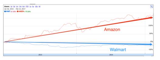 “拋棄”傳統(tǒng)零售巨頭沃爾瑪 F13文件顯示,伯克希爾去年四季度最大的減持來自沃爾瑪,當季沃爾瑪持股減少89%至139萬股,上季度末持有1297萬股,相當于拋售了約9億美元的沃爾瑪股票。 巴菲特接近清倉的拋售凸顯了傳統(tǒng)零售商式微的局面。去年他承認,面對電商巨頭亞馬遜的競爭,傳統(tǒng)零售企業(yè)生存艱難。 2014年年末以來,沃爾瑪股價累跌21%,同期亞馬遜股價暴漲119%。目前沃爾瑪市值2980億美元,亞馬遜市值3560億美元。