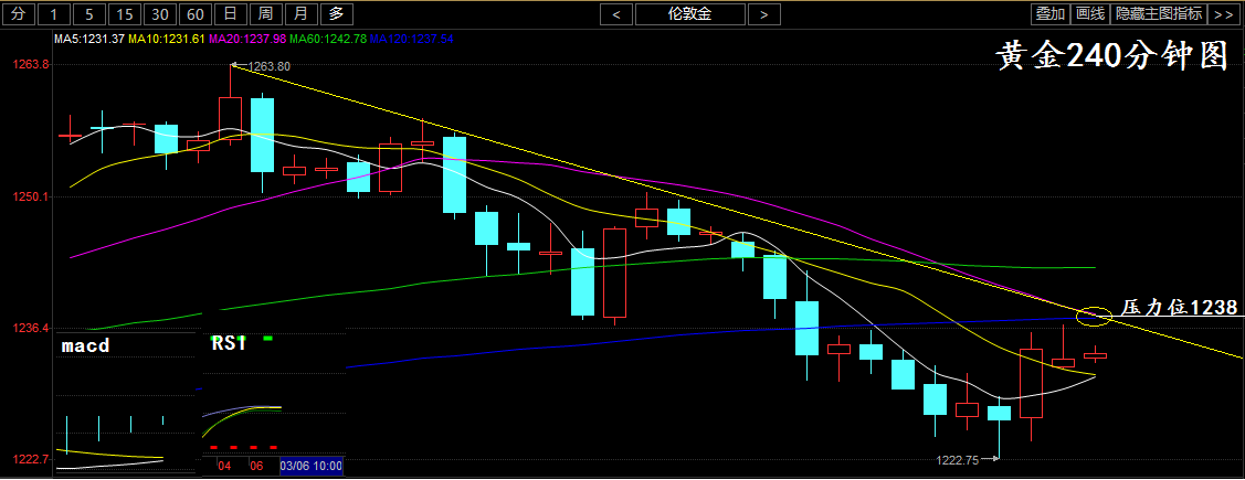 上周黃金不僅結束了周線上的四連漲,還錄得近四個月最大周跌幅。由于美聯儲3月加息預期居高不下,這一趨勢不太可能會改變。 值得重點關注的是,本周五(3月10日)美國將公布2月非農數據,此次數據將成為3月加息決定性因素,投資者應給予重視。 技術分析: 黃金從技術面上分析,從240分鐘級別看來,黃金一改年初的漲勢,目前行情已經處于一個空頭的趨勢中,指標上來看macd指標綠色能量柱縮量,相對強弱指標RSI黏合向下拐頭,黃金行情有小幅反彈但是反彈的力度不大,上方壓力位在1238一線; 黃金操作策略: 建議反彈1238一線布局空單,意外反彈1242一線補倉空,目標下看5-7美元,多單暫不操作; |