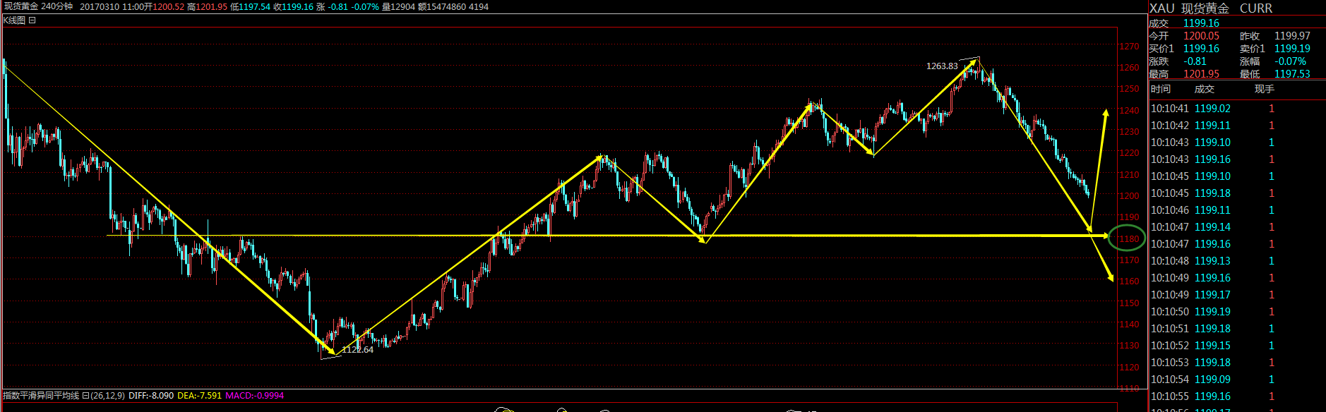 肖禮勇:非農(nóng)導(dǎo)致黃金加速下跌.多頭是否在蓄力 小時圖來看,黃金連續(xù)8連陰不斷開始下跌,MA5與MA10粘合形成死叉向下發(fā)散運行趨勢,附圖指標(biāo)MACD藍(lán)色下跌的動能逐漸較強,DIF與DEA粘合處于0軸下方運行趨勢,RSI指標(biāo)向下發(fā)散運行趨勢,KDJ指標(biāo)向下運行趨勢,4小時圖來看,黃金承壓MA均線運行空頭趨勢,K線排列形成空頭趨勢,附圖指標(biāo)MACD藍(lán)色下跌的動能逐漸緩慢運行,RSI指標(biāo)向下運行趨勢,短期先看1180的支撐位;上方先看1209的阻力位;本周不斷延續(xù)空頭下跌40美金;晚間關(guān)注非農(nóng)數(shù)據(jù);日內(nèi)高位空單操作為主,謹(jǐn)慎抄底! 黃金操作建議: 1200附近空單,目標(biāo)1190,止損1203 原油行情分析: 原油周四延續(xù)下跌。亞盤震蕩修正,歐盤時段反彈50.80附近承壓后爆量破低下行。最低觸及48.80附近。瞬間2美元的大幅下挫完成日內(nèi)的波動。美盤前反抽后圍繞開盤價50.10附近承壓二次下行,但是只是慣性刷了個低點至48.60.最終收盤在49.50中性位置。日圖收盤帶有下影線的陰K線。 日圖收盤比較中性,留出上下影線,短線在趨勢線一帶略有支撐。而收盤也顯示出支撐。加上周三的大陰下挫。均線系統(tǒng)還未完全拐頭,所以需要時間整理。但是K線形態(tài)大陰相對偏空一些。而今日周線才是關(guān)鍵。此前已經(jīng)連續(xù)十二周十字K線。本周若能中陰收盤。收在49.60下方,那么下周還將進一步下行。目前還在整理當(dāng)中。周尾不支持大單邊下跌。偏向震蕩。 短線圖:下探后陽包陰的震蕩。K線暫時進入支撐區(qū)域,昨日破位后沒出現(xiàn)連陰。可見暫時走不出大幅度的下跌。今日傾向于震蕩修正為主。即使下跌。也是震蕩的幅度空間。操作上以震蕩區(qū)間對待。破低后不追單。壓力50.10 50.80 支撐48.50. 原油操作建議: 50.0附近做空 止損50.60 目標(biāo)49.0-48.80. 48.30短多 止損47.80 目標(biāo)49.20. |