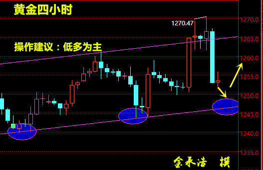 ——黃金走勢分析及解套策略—— 金承浩認為:對于黃金后市的行情,我們必須清楚的認識以下幾點: 1、1250成了多空的重要分水嶺,這里的得失將直接決定,下一步是再次調整還是延續多頭 2、早間美國對敘利亞投放導彈引起黃金瞬間暴漲,這種非常規性的數據刺激導致的行情突破前高,一度突破1270,但是到目前為止又回落至起漲點附近,這樣的突破算不上真正意義上的破位,多頭能否延續重點關注1250的支撐。 3、被套的多單務必萬分警惕,特別是1260以上被套的多單,切不可抱僥幸心理。 在操作上,可以依1250的支撐做多,如果破了1249在做空看回落不遲。只有再次有效突破1263多頭才能真正延續! 下周黃金操作策略:1252做多,止損1248,目標1258,破位減倉持有看1263! 被套多單,如果倉位不重,可在1252附近加倉多單在1256以上多單分批減倉。同時做好止損的準備,如果,一旦突破1248,所有多單直接平倉走人,因為這個多空分水嶺被破了,這次的調整必回到1240一下!再次提醒,多單務必做好風險控制。