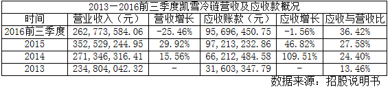 日前,鄭州凱雪冷鏈股份有限公司(以下簡稱為“凱雪冷鏈”)提交了IPO招股說明書,公司擬向社會公開發行2260萬股,登陸上海證券交易所。募集資金共計約27479萬元,其中約13256萬元將用于只能冷鏈末端設備建設項目,9180萬元將投資于智能運輸制冷設備建設項目,5043萬元建設制冷機組技術中心。 通過研讀公司招股說明書,記者注意到,2014年—2016年前三季度,凱雪冷鏈營業收入平均保持了較好的增長態勢,但應收賬款增速遠遠大于營業收入,且應收賬款占營業收入比例不斷增長,使得其業績增長的持續和穩定性有待驗證。同時,報告期內,凱雪冷鏈在2016年申請轉板的前夕,突然實施公司有史以來最大一次的745.9萬股的增資行為,引入大批資管公司,突擊入股的嫌疑頓生。此外,監事會職工監事更換頻繁,引入資管公司后突然更換公司財務負責人,都需要投資人對凱雪冷鏈多一點謹慎和研究。 應收款增幅遠超營收 根據招股說明書提供的財務數據上看,2013—2016年前三季度四個報告期,凱雪冷鏈營業收入分別為,2.348億元、2.713億元、3.525億元和2.628億元,除2016年營收預期增長不大外,整體上大致保持了增長態勢。但是,值得注意的是,凱雪冷鏈的應收賬款的增長速度明顯大于營業收入,2014年,營業收入同比增長僅15.56%,但應收賬款增長高達109.51%,2016年前三季度,營業收入同比2015全年 減少25.46%,但應收賬款卻僅僅減少1.56%。且應收賬款占營業收入比重在不斷上升,從2013年13.46%增長到2016年前三季度的36.42%,鑒于2016年全年數據未披露,預計2016年應收賬款將超過2015年,與營業收入的比值將進一步提高。 一般而言,營業收入的增加勢必伴隨著應收賬款的增加,但凱雪冷鏈這一增長曲線卻略顯詭異。對比凱雪冷鏈所列出同行業公司的四方冷鏈和松芝股份,冷鏈行業在2014年末開始,一直持續到2016年三季度,營業收入和營業利潤出現了雙下滑,這在整體規模不大的四方冷鏈表現更加突出,而松芝股份營收基本停滯不前,而盈利能力卻不斷下滑。此時的凱雪冷鏈,2015年反而是增長最塊的年份,這與行業的走勢明顯不符,而值得注意的是,當年的應收賬款也為報告期內的最高點。不過凱雪冷鏈的公司現金流量卻還是正常的反映了這一行業的走勢,2014年至2016年前三季度,現金流量凈額分別為-1699.66萬元;863.18萬元;5616.36萬元。由此可見,應收賬款的增幅超過營收增幅,且營業收入比重不斷增加似乎可以找到解釋。而凱雪冷鏈2014年至2016年前三季度財務數據,或許需要投資人保持更高的謹慎和給予更多的分析。
