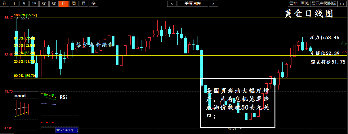 因對全球供需接近平衡的預期增強,上周原油收復了3月的失地,油價均連續第三周周線上漲,歐佩克官員稱60美元/桶的水平為理想售價,并稱60美元/桶的水平既能鼓勵石油行業投資,又不會過多地刺激美國頁巖油產商增產,這顯示出其通過控制供應來影響市場的決心。 沙特阿美CEO認為美原油產量將給油市帶來下行壓力,但油市整體趨勢仍保持向上,隨著油價上漲,華爾街大型投行增加對能源企業的放貸,頁巖油產量漲勢將愈演愈烈; 原油從技術面上來看,指標上來看macd技術指標紅色能量柱縮量,但是相對強弱指標RSI拐頭向下,原油的行情有回落的需求,在黃金分割線上來看,行情承壓黃金分割線0.618一線承壓回落,所以上方的壓力位在53.46美元,下方支撐位在52.39一線,技術面操作上以反彈做空操作為主; 原油操作策略: 建議反彈53.35附近布局空單,目標0.5美元,止損0.3美元; 建議下方52.40-52.50腹肌布局多單,目標0.5美元,止損0.3美元; |