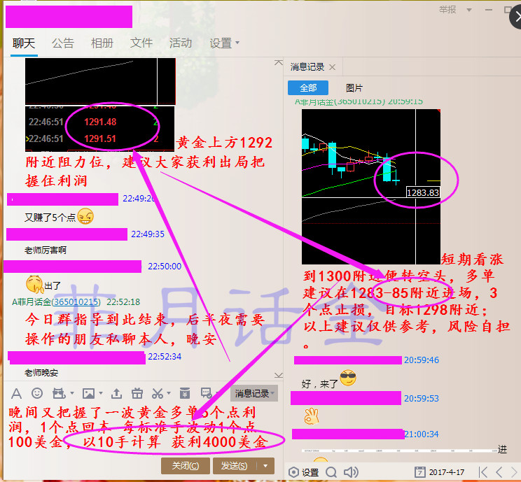 倫敦金技術分析: 日線圖上看:自上周四K線高位收取小陽線后,昨日金價再創新高后承壓回落,刷新了上周四的低點,收盤于1284.82,K線收取高位螺旋槳形態,終結了三連陽上漲態勢,日線上金價短線回調信號明顯,趨勢依然看多。下方支撐關注1275-1278一線,上方關注1288-1293一線。思路上長多短空。 建議1287-1290分批空,止損1293,目標1280-1277; 做多方面,建議1277-1279一線多,止損2775,目標1285-1289 昨日本人實倉兩單完美獲利10個點; 有人說這個世界上我們唯一可以不勞而獲的便是時間,想想也是,2016年在幾次大的金融事件下已匆匆過去。如今2017年已經到來,全新的一年,可能說過去這一年你因為不了解風險,不具備技術等等原因而導致現貨投資這一塊沒有做好,那么2017年隨著你自身經驗的越來越豐富以及證監部門不斷對市場進一步完善,只能說目前給我們創造的條件是越來越好,這個時候菲月認為我們就應該要像一匹狼一樣果斷出擊,大膽的去賺回我們的虧損,理智的去把握市場中的利潤,井然有序的實現你進入這個市場所想要完成的夢想!