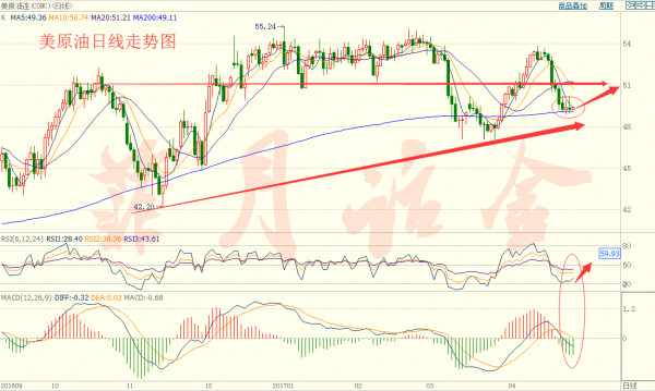 日線技術(shù)走勢來看,K線交投在200均線上方,指標(biāo)MACD綠色柱能出現(xiàn)縮量,強弱指標(biāo)RSI從20水平線反彈收窄,表明油價有企穩(wěn)的跡象,而且昨日的EIA原油庫存減少支持當(dāng)前油價,所以關(guān)注一下油價后期的反彈情況,關(guān)鍵阻力在51.20一線附近,支撐在48.0美元位置,原油區(qū)間: 48--50。