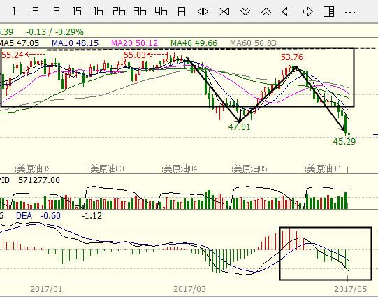 原油日線上看整體破了46美元,這樣的趨勢也反映出空頭力量相對來說是比較強的、在原來多檔支撐被擊破的情況下,原油如果今天破了45.30、那么后市就會往44.5沖擊。目前來看原油需要重點關注45美元一線的支撐。今天是周五,也是即將收周線的日子,在過去的一周原油以四連陰結束。原油能否收復失地,還看今天非農數據的情況。
