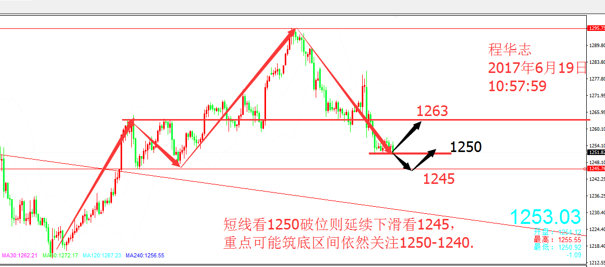 程華志:美聯儲出現嚴重分歧,黃金走勢存在三個關鍵支撐 價格密集盤整之后的突破,通常是值得冒險的交易機會。 市場消息面解讀: 上周美聯儲實施了今年以來的第二次加息,主席耶倫表示,她相信近期疲弱的通脹數據是暫時性的。不過,在上周加息時投下唯一反對票的明尼亞波利斯聯儲主席卡什卡利卻暗示,懷疑情緒正在滋長。 客觀來講,自從3月提高利率以來,勞動力市場收緊,但通脹已經下降,似乎市場并未更靠近通脹目標。上周的加息本應延遲,以便更清楚地觀察,最近核心通脹疲弱是更疲弱趨勢的開始,還是僅僅是暫時現象。而耶倫卻從“鴿后”搖身一變露出鷹爪,確定加息并且發表強硬言論刺激市場,從而導致近期黃金的下跌。 從當前市場數據方面來看,美國經濟并非如耶倫所說的那么樂觀。就在上周三結束的美聯儲會議之前,美國商務部發布的數據顯示,5月零售銷售創下自2016年初以來的最大跌幅。而一天之后公布的數據也顯示,制造業產出下降,建筑商信心下滑。這些數據的疲軟表現肯定會引起市場對于美聯儲后續加息的次數帶來懷疑。 盡管近期黃金價格收到加息影響下跌,但是從往期走勢來看,黃金價格通常會在加息周期后反彈。作為一個避險產品,在不穩定時期是保值的良好的手段,盡管全球金融經歷了十年的風暴,但未來仍是不確定的。 國際黃金走勢解析: 上周經過美元加息帶來的沖擊,黃金跌勢加深。本就一次以1295美元為雙頂的回調走勢變成纏繞下跌的空頭格局。多頭前期構筑的種種上升結構終究抵不過美元走強帶來的利空。從1295美元開始的下跌已經維持了接近兩周時間,整體下跌幅度達到了40余美金。從當前盤面走勢來看,這一場弱勢下跌在短期較難有改變,但是由于近期地緣政治風險的不斷出現(通俄門、涉俄調查)以及美聯儲出現的內部分歧等等因素,市場可能會重新考慮黃金價格的走向,所以這一輪回落剩余的下方空間可能并沒有我們想象中那么大。 趨勢上,雖然當下黃金短線依然便顯出空頭格局,但是我們需要注意一點,隨著價格越來越低,出現買盤支撐的強度也比之前要更加強,這一點從價格跌至靠近1250美元之后跌勢緩和就能很明顯的看出來。針對后續走勢而言,有三個比較重要的關鍵性支撐位,第一就是當前價格所處的1250美元,這里是一個市場心理支撐位,短線會起到一定的支撐作用,但也僅僅限于短線反彈。第二就是1245美元,這個點位體現在短周期技術面上是一個比較關鍵的橫向支撐,價格是有可能在附近選擇止跌筑底的。第三就是多頭最后一道防線,由1180/1195/1215三個低點所連成的支撐趨勢線,這個點位的支撐會隨著時間的推移而不斷抬高,所以現在暫不給出具體點位。這三個支撐位都是我們在短線做空時候需要關注反抽的點位,也是我們嘗試博弈多單的關鍵位置。 短線重點關注點位: 中線思路參考上述三個關鍵支撐,短線繼續區間弱勢震蕩思路即可,考慮到價格收到買盤支撐較強,可在關鍵支撐博弈多單。亞歐盤首次反彈1254-1255美元空單進場,損1258上,目標下看1245-1247美元。若日內價格先走反彈破位1260美元,則回撤布局多單,具體點位筆者根據實際短線情況給出。 你是否聽了很多大道理,可依然做不好交易。學習了很多理論知識,可仍然不能游刃有余。如果我們不貪婪,我們不會被打敗,如果我們不恐懼,我們將獲得勝利,有時候想證明給一萬個人看,但發現最后能懂的只有自己。市場的生存法則就是弱肉強食,注定有一批人將被市場所淘汰。佛度有緣人,我帶有心人。 以上分析不做具體進場點位,僅供參考。投資有風險,入市需謹慎。對行情有疑問或者操作不理想的朋友可與筆者本人溝通。 文/程華志 |