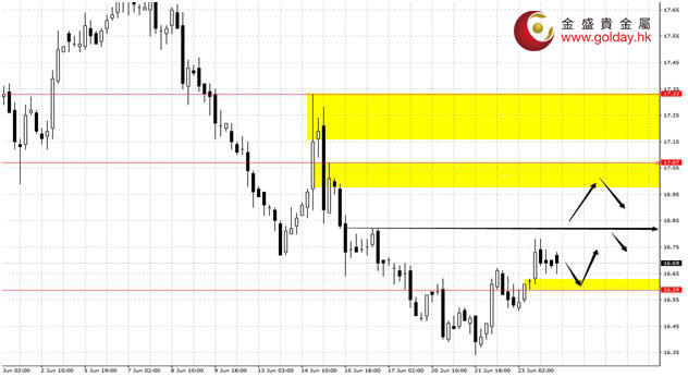 白銀技術分析: 現貨白銀周一(6月26日)亞盤和歐盤繼續震蕩走高,美盤基本維持高位震蕩。上方關注16.97-17.06和17.30-17.45美元/盎司區間的阻力。下方關注16.62、16.53-16.50和16.48-16.46美元/盎司的支撐,回調該位置繼續做多。目前我們傾向于回調做多。 白銀操作建議: 上方阻力:16.62、16.82-16.86、17.00、17.30-17.45 下方支撐:16.53-16.50、16.48-16.46、16.43-16.33 今日重要數據: 20:30 美國5月耐用品訂單月率 20:30 美國5月芝加哥聯儲全國活動指數 22:30 美國6月達拉斯聯儲商業活動指數 23:00 歐洲央行行長德拉基(Mario