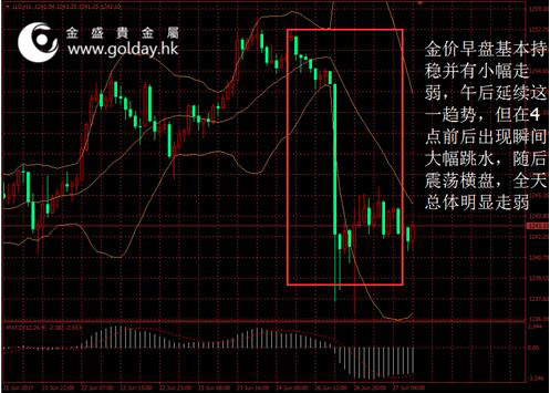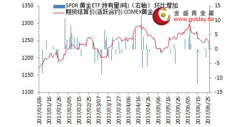 上一交易日現(xiàn)貨黃金開(kāi)盤1256.96美元/盎司,最高1257.82美元/盎司,最低1236.64美元/盎司,收盤1244.38美元/盎司,收盤大跌11.23美元,跌幅0.89%。日內(nèi)來(lái)看,金價(jià)早盤基本持穩(wěn)并有小幅走弱,午后延續(xù)這一趨勢(shì),但在4點(diǎn)前后出現(xiàn)瞬間大幅跳水,隨后震蕩橫盤,全天總體明顯走弱。美元指數(shù)有所走強(qiáng),消息面對(duì)金價(jià)影響較小,現(xiàn)貨市場(chǎng)資金有所流入,技術(shù)面走弱有限。 圖1黃金價(jià)格走勢(shì) 消息面上看,美國(guó)5月份不含飛機(jī)的非國(guó)防資本品訂單下降0.2%,弱于預(yù)期的為增長(zhǎng)0.4%,整體耐用品訂單下降1.1%,降幅幾乎為預(yù)期的兩倍,表明資本品投資降溫料拖累二季度經(jīng)濟(jì)增速。此外,美國(guó)5月份芝加哥聯(lián)儲(chǔ)全美活動(dòng)指數(shù)和6月份達(dá)拉斯聯(lián)儲(chǔ)制造業(yè)指數(shù)均遜預(yù)期。結(jié)合前期數(shù)據(jù)看,至少截止到5月美國(guó)經(jīng)濟(jì)擴(kuò)張速度的回升不及市場(chǎng)預(yù)期,這對(duì)金價(jià)運(yùn)行趨勢(shì)偏多。 此外,美國(guó)最高法院恢復(fù)部分特朗普旅美禁令,法官們?cè)谝环轃o(wú)簽名的意見(jiàn)中表示,禁止主要人口為穆斯林的六國(guó)公民進(jìn)入美國(guó)的行政命令現(xiàn)在可以全面實(shí)施,除非相關(guān)人等可以證明自己與美國(guó)的個(gè)人或?qū)嶓w有可信的誠(chéng)善關(guān)系。這或意味著特朗普與部分其他官員可能達(dá)成某種交易,未來(lái)推行政策受到的阻力可能將減小,對(duì)金價(jià)不利。 歐洲方面,歐央行行長(zhǎng)德拉吉捍衛(wèi)寬松立場(chǎng),稱歐元區(qū)經(jīng)濟(jì)復(fù)蘇利于青年人就業(yè),央行的最佳政策路徑是維持激勵(lì)政策直至經(jīng)濟(jì)恢復(fù)穩(wěn)定,表明其仍在向市場(chǎng)傳遞近期不會(huì)結(jié)束寬松的信號(hào)。但是隨著QE標(biāo)的幾乎被歐央行全部購(gòu)買,未來(lái)政策施展空間十分有限,我們?nèi)灶A(yù)計(jì)下半年歐央行將推出QE并且不排除加息的可能性。