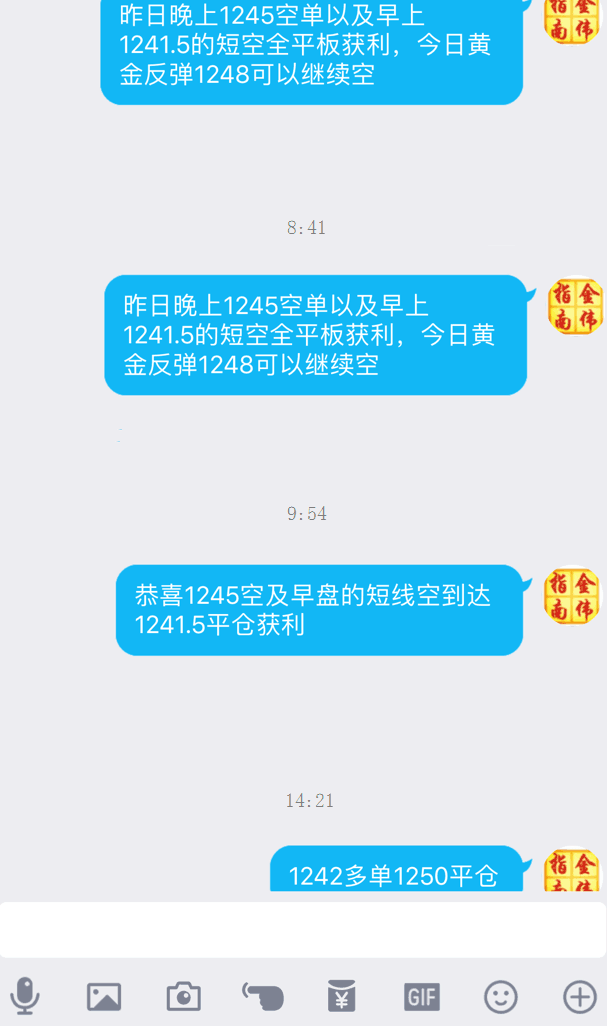 金偉指南:黃金多空獲利,反彈接著空 ! 目前黃金大幅上漲,我們昨日黃金大跌前,以多為主,跌了后我們果斷在1248、1245做空,包括昨晚,我們也是一直看空,到了今早,我們的系統提示做多的信號,我們就一直強調昨晚黃金下探形成雙針探底信號后,黃金一直在1240上方震蕩,重點說了短期看1240這個關鍵的支撐位,不破此位黃金反彈為主,目前來看,行情果然如同我們系統提示一般再走,恭喜一直關注我們的朋友,準確把握到行情的變化,如果想要準確的進場點位就加入我們吧。 黃金目前突破1250一線,小時線收線于1250上方,也就是說站穩1250,那么從昨天的大跌,到今天的行情反轉,確實走的很妖,早盤提示1245空到達1243離場,反手做多也提示了短線看反彈,目前雖然反彈力度較強,但是,白盤延續走高的可能性不大,短線暫時看回落,回落后再擇機進場做多,既然行情選擇了反轉,那么,跟隨趨勢,順勢而為,黃金近期的多空轉換很快,盤中的思路不要死腦筋一成不變,在投資市場里一定要保持隨時應對突發行情的準備。 今天上海學習 內部群內指出1245空1241.5平倉獲利 反手做多到1250平倉多單平倉,論壇沒能及時跟上抱歉 等機場位置錯過,短線1253以空為主。 黃金反彈以空為主…… 我們一直以來都是以穩定獲利而著稱,我們的操作系統也是穩步獲利的系統,相信經常關注我們的朋友們應該知道我們的實力和操作。馬上布局機會來了,將會帶領大家賺到不菲的收益,你將收獲的是一次賺大錢的機會,更重要的是能建立在黃金市場里面的操作思路及系統,因為你沒有針對性的做過波段布局,所以很多時候你在黃金市場里面很迷茫,或者目前還沒賺到什么錢,只要你跟上我們布局機會,錢賺到了,更重要的是樹立了你在黃金市場的自信、理念、穩步獲利的操作思路。 |