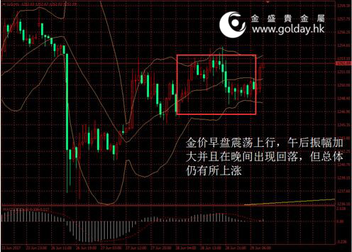 上一交易日現(xiàn)貨黃金開盤1246.93美元/盎司,最高1254.49美元/盎司,最低1246.20美元/盎司,收盤1248.96美元/盎司,收盤小幅上漲2.06美元,漲幅0.17%。日內(nèi)來看,金價早盤震蕩上行,午后振幅加大并且在晚間出現(xiàn)回落,但總體仍有所上漲。消息面略偏空,但美元指數(shù)刷新8個月以來低位,主要現(xiàn)貨投資者資金不變,技術面上看仍偏多。 圖1黃金價格走勢 消息面上看,組日公布的數(shù)據(jù)顯示,美國5月份商品貿(mào)易逆差從4月份的671億美元縮小至659億美元,這對第二季度經(jīng)濟將有所推動。另外美國5月份二手房簽約量環(huán)比下降0.8%,比市場預期的1%弱,結合此前的其他數(shù)據(jù)看,待售房有限遏制銷量增長空間。美聯(lián)儲方面,舊金山聯(lián)儲行長Williams稱,美國的實際工資增速超過生產(chǎn)力,這是經(jīng)濟走強的跡象。總體來看,美聯(lián)儲官員的態(tài)度偏鷹派,并且經(jīng)濟數(shù)據(jù)表現(xiàn)較好,這些對金價來說均偏利空。 歐洲方面,此前德拉吉的貨幣政策表態(tài)引發(fā)市場疑問,昨日知情官員解釋稱,歐洲央行行長德拉吉周二的講話原意是在承認歐元區(qū)經(jīng)濟強勁和警告仍然需要貨幣政策支持之間取得平衡。歐洲央行副行長Constancio也表示,德拉吉的講話完全符合現(xiàn)行政策。但昨日歐元在大幅回落之后又迅速回升,并且創(chuàng)近一年高位,顯示市場正在逐步將歐央行收緊貨幣政策的預期計入價格,美元指數(shù)因此受到一定壓制。