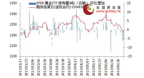 上一交易日現(xiàn)貨黃金開盤1226.67美元/盎司,最高1228.67美元/盎司,最低1217.31美元/盎司,收盤1226.69美元/盎司,收盤上漲3.91美元,漲幅0.32%。日內(nèi)來看,金價早盤沖高回落,午后持續(xù)走弱,至晚間震蕩回升,全天總體寬幅震蕩。美元指數(shù)沖高回落,消息面多空夾雜,主要現(xiàn)貨投資者再次減倉,技術(shù)面繼續(xù)修復。 圖1黃金價格走勢 消息面上看,數(shù)據(jù)顯示美國5月份工廠訂單較前月下降0.8%,弱于預期的下降0.5%。此外,美聯(lián)儲6月份會議紀要顯示,決策者未能就何時啟動縮表達成一致,部分官員偏向未來數(shù)月內(nèi)宣布啟動縮表,而另一些決策者強調(diào),推遲到今年稍晚再做決定將有更多時間評估經(jīng)濟活動和通脹前景。該情況與此前的會議聲明,以及近期主要官員的表態(tài)情況較為一致,目前美聯(lián)儲內(nèi)部的分歧出現(xiàn),但是市場更傾向于認為9月開始縮表,12月開始加息。且根據(jù)聯(lián)邦基金利率期貨,市場正在將該預期計入價格,這對金價走勢并非利多。 另外,聯(lián)合國安理會就朝鮮最新挑釁行動召開緊急會議,美國代表稱,朝鮮的導彈試射正在迅速關(guān)閉外交解決的大門,倘若必要美國將對朝鮮動武。這一表態(tài)可能將加劇地緣形勢的緊張。中國和俄羅斯尚未有明顯區(qū)別于此前的態(tài)度。同時,中國邊界被印度越界一事尚未解決,地緣政治形勢正在逐步惡化,這對金價是潛在的利多。
