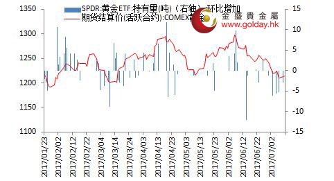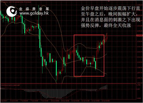 上一交易日現貨黃金開盤1214.03美元/盎司,最高1217.28美元/盎司,最低1208.04美元/盎司,收盤1217.25美元/盎司,收盤上漲3.2美元,漲幅0.26%。日內來看,金價早盤開始逐步震蕩下行直至午盤之后,晚間振幅擴大,并且在消息面的刺激之下出現強勢反彈,最終全天收漲。美元指數也因此回落,主要現貨投資者資金不變,技術面走勢繼續改善。 圖1黃金價格走勢 消息面上看,昨日公布的美國5月JOLTS職位空缺數為566.6萬人,從紀錄高位下滑,不及預期和前值,但總體來看美國就業需求依然旺盛。美聯儲方面,理事Brainard表示,若經濟保持強勁,支持“不久后”縮減資產負債表,但對加息持謹慎立場。總體來看,美聯儲內部的分歧繼續,且目前對于縮表較為積極,加息則維持此前的政策路徑。 另一方面,昨日特朗普長子公布一系列電郵通信,承認去年與一名俄羅斯律師會面之前已獲知,這名律師手握來自莫斯科、可能不利希拉里•克林頓的材料,且他們希望能利用這些信息幫助特朗普競選。包括黃金在內的避險資產價格因此大幅回升。