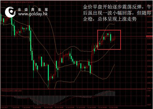 今日現貨黃金開盤1217.17美元/盎司,截至北京時間下午5點20分,最高價格為1220.38美元/盎司,最低價格為1216.35美元/盎司。日內來看,金價早盤開始逐步震蕩反彈,午后雖出現一波小幅回落,但隨即企穩,總體呈現上漲走勢。美元指數基本不變,消息面變動也不大。 圖1金價日內走勢 消息面今天變化不大。數據顯示,6月請領失業金人數增加6000人至82.9萬人,好于市場預期的增加1萬人。截至5月的三個月按國際勞工組織標準計算的失業人口減少6.4萬人至149.5萬人;失業率為4.5%,低于市場預期的4.6%,并且創下1975年以來的最低。此外,歐元區數據顯示,5月工業產出同比增速4%,環比增速1.3%,均超出預期和前值。總體來看,歐洲經濟復蘇仍在繼續,并未將來歐央行潛在的緊縮創造條件。 市場層面看,日本股市收低,出口類股遭受沖擊,市場等候美聯儲主席耶倫的講話,日經指數跌0.5%報20098.38點。中國股市第三日收跌,調整壓力加大金融權重股沖高回落,上證綜指收報3197.54點,跌5.5點或0.17%。香港股市則連漲三日并創兩年最高收位,受內地資金流入提振,恒生指數收高0.6%至26043.64點。匯率方面,美元兌日圓走勢停滯,英鎊匯率上行,美元指數午后振幅加大總體微漲。國際能源價格上漲逾1%,美國政府下調明年原油生產前景,且石油庫存大幅減少,布倫特油價漲幅約1.5%。 技術面上看,此前金價在1200美元上方企穩震蕩,空頭攻勢持續放緩,日內壓力仍位于1222美元附近。短期來看,1200美元整數關口仍是重要支撐,上方短線壓力位于1238美元位置附近,保持謹慎偏樂觀態度對待。中期來看,1260美元附近的壓力也需要予以警惕,上方重要壓力仍在1295至1300美元附近,下方下一個支撐或位于1185美元附近。 今晚10點美聯儲主席耶倫在眾議院金融服務委員會作半年度貨幣政策證詞陳述,需要重點關注。 投資有風險,入市需謹慎。以上建議僅供參考,不作為唯一投資依據。