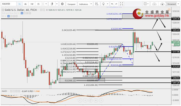 現貨黃金周三(7月12日)亞市早盤開于1217.00美元/盎司,最低下探1213.40美元/盎司,最高上漲至1225.45美元/盎司,收于1219.82美元/盎司,上漲2.72美元,漲幅0.22%。 昨日美聯儲主席耶倫在國會作證,耶倫書面證詞偏鴿派,對金價形成一定的支撐。耶倫稱通脹對經濟狀況的反應是一大不確定因素,利率無需進一步升高太多即可達到中性狀態。美聯儲密切關注通脹進展,對通脹持續低于2%的目標保持警惕。耶倫并表示這可能是其最后一次在國會發表證詞。 荷蘭銀行指出,美聯儲主席耶倫眾議院證詞顯示,對通脹前景略顯更謹慎,暗示美聯儲貨幣政策前瞻指引存下行風險,當前FOMC預計截至2018年年底將有四次加息,但耶倫的證詞可能令此路徑更顯緩慢;截至2018年年底美聯儲或僅加息三次,甚至更少,因美國通脹前景存下行風險。 瑞典北歐斯安銀行表示,隔夜美聯儲主席耶倫在眾議院的證詞強化了該行的觀點,即美聯儲處于觀望模式,下次加息時間節點是兩難決定,暫時仍認為將于9月進行;在縮表方面,耶倫的態度含糊不清,仍預計美聯儲將于9月決定縮表,并于四季度宣布開始實施。 加拿大央行7月如期加息25點,下次加息料于10月進行; 加拿大帝國商業銀行表示,加拿大央行7月決議如期加息25個基點至0.75%,除了指出今后進一步調整利率將取決于新的經濟數據表現外,并未對下次加息節點發出明確暗示,不過料于10月進行,因跳過9月貨幣政策會議后,加拿大央行方可暗示加息過程逐步進行。 7月13日黃金ETFs數據顯示,截止7月12日黃金ETF-SPDR Gold Trust的黃金持倉量832.39噸,較上一交易日持平;Gold Trust 7月13日數據顯示,Gold Trust 7月12日黃金持有量211.41噸,較上一交易日持平。白銀持有量10855.49噸,較上一交易日增加61.76噸。 黃金技術分析: 現貨黃金周三(7月12日)亞盤和歐盤再度小幅震蕩走低,美盤受鴿派講話影響出現大幅上揚,后利好逐步消化。上方重點關注1225.50和1230美元/盎司附近。下方暫時關注1218美元/盎司一線,也是回調0.618的位置,如果保持上方依然保持多頭思路不變,如果下破,可能會回到1213美元/盎司附近。 黃金操作建議: 上方阻力:1225、1230、1240-1245