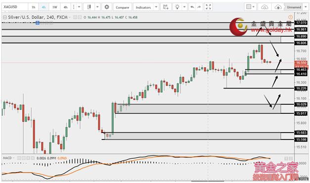 下方支撐:1248-1244、1238、1231.60 白銀技術分析: 現貨白銀周三(7月26日)亞盤和歐盤維持高位震蕩,美盤大幅沖高回落,完美到達我們上方給大家的阻力區間16.80-16.90美元/盎司。上方關注16.80-16.90和16.98-17.07美元/盎司的阻力,首次觸及可以考慮做空,下方關注16.46-16.40和16.22美元/盎司兩個支撐位。 白銀操作建議: 上方阻力:16.80-16.88、16.98-17.07 下方支撐:16.46-16.40、16.22、16.03-15.95 今日重要數據: 20:30