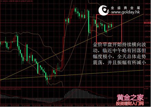 今日現貨黃金開盤1259.25美元/盎司,截至北京時間下午5點20分,最高價格為1260.73美元/盎司,最低價格為1257.24美元/盎司。日內來看,金價早盤開始持續橫向波動,臨近中午略有回落但幅度極小,全天總體走勢震蕩,并且振幅有所減小。消息面幾乎沒有變動,美元指數略有回落,技術面較為平衡。 圖 1 金價日內走勢 消息面上看,今日公布的數據顯示,日本6月全國CPI同比增長0.4%,核心CPI同比增長0.4%,二者均符合預期且與前值相同。6月零售銷售同比增長2.1%弱于預期的2.4%。總體來看,日本經濟中消費的貢獻正在上升,經濟受此拉動仍有繼續復蘇的可能性,但是通脹方面仍沒有顯著走高,且我們預計今年下半年這一反彈仍將溫和。上述數據顯示日本經濟穩步增長,支持日本央行對經濟的樂觀評估和不急于退出寬松的決定。 歐洲方面,法國統計局發布的報告顯示,第二季度GDP初值環比增長0.5%,其中出口攀升幫助抵消掉企業庫存下降和商業投資放緩的影響。這是法國連續第三個季度錄得0.5%的增長率。同時,法國7月CPI同比0.7%,環比-0.3%,完全符合預期并與前置想接近,暗示未來公布的7月歐元區總體通脹數據可能不會有太大波動。 市場層面看,日本股市下跌,今日公布的零售數據弱于預期,但總體趨勢繼續圍繞20000點震蕩,日經指數下跌119.8點或0.6%至19959.84點。中國股市收漲至三個半月新高,但總體漲幅有限,消費及鋼鐵、有色等周期性板塊領漲,上證綜指小幅收漲3.46點或0.11%至3253.24點。香港股市低開低走,從兩年多以來高位回落,恒生指數下跌151.79點或0.56%至26979.39點。匯率方面,日內美元指數略有回落,此前美聯儲會議的影響已經趨于消散,市場等待今晚的美國GDP數據。國際能源價格承接昨晚的反彈,今日略有走升,在今晚美國公布本周石油鉆井數據之前市場價格變動不大,布倫特油價漲0.21%仍保持50美元以上。 技術面上看,金價日內繼續圍繞1260美元震蕩,但暫未確認突破該位置,今晚的美國經濟數據可能將令金價做出方向性選擇。短期來看我們仍保持樂觀,1257美元仍可暫視作日內支撐位。中期來看,1295至1300美元附近仍是重要壓力位,下方重要支撐仍位于1200美元整數關口,中期可暫繼續按照震蕩反彈對待。 此外,今晚8點30分美國公布第二季度GDP數據,凌晨1點30分美國明尼阿波利斯聯儲主席卡什卡利參加活動或發表講話,上述事件需要重點關注。 投資有風險,入市需謹慎。以上建議僅供參考,不作為唯一投資依據。