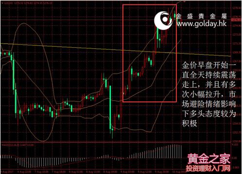 上一交易日現貨黃金開盤1260.73美元/盎司,最高1278.58美元/盎司,最低1260.39美元/盎司,收盤1277.06美元/盎司,收盤上漲16.4美元,漲幅1.3%。日內來看,金價早盤開始一直全天持續(xù)震蕩走上,并且有多次小幅拉升,市場避險情緒影響下多頭態(tài)度較為積極。美元指數略有回落,消息面利多為主,主要現貨投資者倉位不變,技術面明顯走強。 圖1黃金價格走勢 消息面上看,美國圣路易斯聯儲行長James Bullard表示,春季時通脹疲軟讓美聯儲感到意外,若通貨膨脹不達標,將損害美聯儲的公信力;芝加哥聯儲行長Charles Evans支持在9月份宣布縮表。前者發(fā)言繼續(xù)符合其一貫的改派表態(tài),并且從美聯儲內部總體來看,大部分官員尤其是有投票權的委員,在加息問題上仍偏鴿派。大部分官員贊成9月縮表,但是縮表對市場的直接影響非常小。總體來看美聯儲的態(tài)度對金價仍偏利多。 此外,美朝之間的言論對抗仍在繼續(xù),朝鮮宣稱將在8月中旬完成打擊關島計劃,擬向關島發(fā)射四枚中程導彈,然后等待朝鮮領導人金正恩作出是否繼續(xù)推進的指令。市場避險情緒繼續(xù)大幅升溫。昨日VIX指數、瑞郎匯率、以及金價等全面走高。這一情況仍需持續(xù)關注。