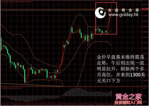 今日現貨黃金開盤1288.06美元/盎司,截至北京時間下午5點20分,最高價格為1297.69美元/盎司,最低價格為1285.84美元/盎司。日內來看,金價早盤基本維持震蕩走勢,午后則出現一波明顯拉升,刷新兩個多月高位,并來到1300美元關口下方。美元指數震蕩走弱,消息面相對平靜,技術上看多頭占優。 圖1金價日內走勢 消息面上看,數據顯示歐元區6月經常帳281億歐元,季調后數字為212億元。歐元區6月工作日調整后建筑業產出同比3.4%,強于前值2.6%。但上述數據前者受市場關注程度較低,因此沒有引起波動,后者則拉升了歐元走勢,并壓制美指對金價有一定利多影響。 另外,美國白宮昨日表示,總統特朗普已經放棄成立基礎建設顧問委員會的計劃,此前特朗普有關于白人至上主義的談話所引爆的怒火,已經導致兩個顧問委員會解散。上述情況或令未來特朗普政府推出更多刺激計劃面臨阻力,對金價而言是一利多因素。 市場層面看,日本股市跌至三個月低位,并連續第五周收跌,受美股和美元走低的沖擊,外界愈發擔心美國總統特朗普能否推進相關政策來提振美國經濟增長,日經指數跌1.2%收報19470.41點。中國股市微收升,昨晚歐美股市大跌拖累今日大盤低開震蕩整理,預計大盤經過充分整理消化后,仍會上攻3300點,上證指數收盤幾乎持平,微漲0.01%至3268.72點。香港股市收跌,恒生指數收跌1.1%至27047.57點。匯率方面,美元指數日內走弱,尤其是在午后開始擴大振幅并加速下行。國際能源價格基本持穩,受到金融市場全面疲軟的影響,但同時有跡象顯示油市供應正逐漸收緊,布倫特油價上漲0.1%。 技術面上看,金價早盤基本維持震蕩走勢,午后則出現一波明顯拉升,刷新兩個多月高位,并來到1300美元關口下方。短期來看,1292美元前高位置已經被突破,以1300美元為中心的1295美元至1310美元一線是密集壓力區間,需重點關注該位置,一旦確認突破,上行空間將會打開,下方1260美元附近是重要支撐。中期來看,1220美元和1200美元整數關口仍是關鍵分水嶺,下一個壓力位可能在1337美元的高點附近。 此外,今晚10點將公布美國8月密歇根大學消費者信心指數初值數據,10點15分達拉斯聯儲主席卡普蘭發表講話。上述事件需要予以關注。 投資有風險,入市需謹慎。以上建議僅供參考,不作為唯一投資依據。