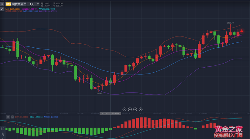 市場消息面: 上周西班牙發(fā)生恐怖襲擊,美國白宮人事變動(班農辭職),避險情緒進一步升溫,大量資金流出股市,而黃金受避險情緒推動,維持在高位。 周一(8月21日)因美韓軍事演習在即,地緣政治風險或再次上升,市場緊張情緒加劇,美元指數下跌,主要非美貨幣與現貨黃金則趁勢攀升,目前基本面利多黃金。 此外,市場還關注杰克遜霍爾央行會議,美聯(lián)儲主席耶倫和歐洲央行行長德拉基的表態(tài)成為市場焦點所在。有市場人士指出,如美聯(lián)儲主席耶倫在周五杰克遜霍爾央行會議上的演講中強調需要密切關注通脹目標和金融穩(wěn)定性風險,那么美聯(lián)儲加息預期可能會升溫,這或成為美元扭轉頹勢的關鍵時刻。 黃金技術面: 昨日黃金現小幅漲勢,黃金在觸及MA10均線之后反彈,目前看來,K線處于MA5均線上方,MA5和MA10呈現上行趨勢,布林帶上軌一改縮口局面,漸漸變成平行的狀態(tài)。快慢線也開始平行,能量柱沒有太大的起伏,總的趨勢較為平穩(wěn)。昨天黃金收于大陽線,意味著黃金價格一改一路走低的局勢,再次朝多頭方向發(fā)展。目前MA5均線走勢較平緩,甚至出現下穿MA10的跡象,快線下行,能量柱開始縮減,黃金行情走勢減緩。 整體看來,目前黃金處于漲勢,小周期盤整,日內關注支撐1288-1283,上方阻力1295一線,周初行情走勢緩慢,可以多等一下,等待方向明確再操作,日內操作上筆者建議維持低位做多為主。 8.22黃金操作建議: 回踩1288做多,止損1284,止盈看1295-1300; |