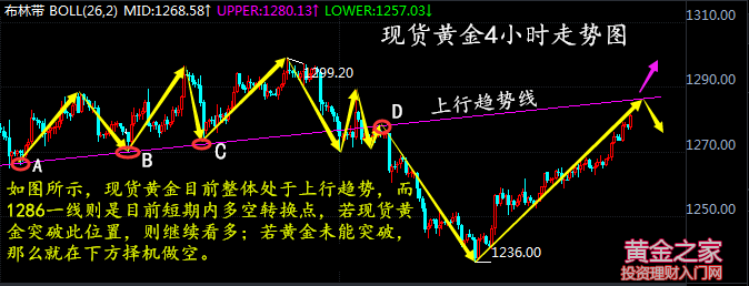 昨天歐盤橫盤震蕩,大家都在等待,結果錯過了美盤的上升,今天日線收陽后,亞盤價格也沒有多少回調,之前空頭下跌過程中,沒有給過多頭機會,那么現在上升行情也是一樣,只會一波到頂,所以根本不需要期待有回調做多的點位,現在來看1285已經到位,而歐盤剛剛開始漲,小時線正在逐步推進,進一步看漲到1290也是一線之隔。 技術面上日線隔日繼續錄得實體陽線,拋開周一的休市日線已經錄得四連陽,并且勢能是越走越強,多頭上攻步伐矯健,日線突破上方均線的壓制后后續將關注前期阻力位1299一線的壓制,短線上布林帶有走平跡象,MA5上穿MA10形成金叉,附圖指標MACD多頭紅色能量柱繼續放量,上方空間目前并未全部打開,從大區間來看上方千三將是后續黃金走勢的關鍵分水嶺。 四小時上升由弱再度轉強且沒有過多的回調,短線布林帶開口向上運行,價格也依托上軌線攀升,均線系統呈多頭排列,MA5上穿MA10形成金叉,附圖指標MACD多頭紅色能量柱繼續放量。短線上看,金價已經突破1280一線阻力,短期阻力轉為支撐位置,阻力方面進一步上看1286附近;操作上繼續回撤做多為主。 現貨黃金日內操作建議: 1、下方回落1278做多,止損4個點位,目標看1285,上破繼續持有; 2、上方觸及1286輕倉空,止損4個點位,目標看向1279; 人生道路曲曲折折,遇見不少的過客,希望我能成為那個常駐只客。 文/張玄生 |