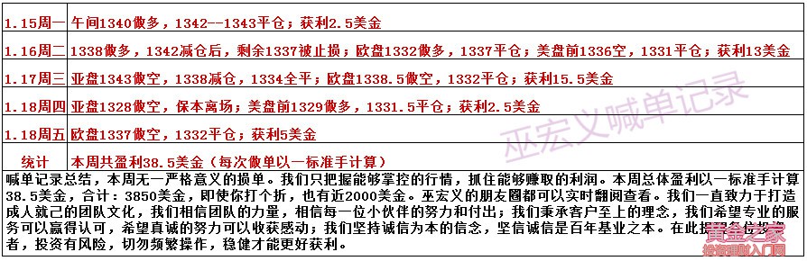 做對一單二單很容易,出現錯誤也很正常,沒有百分百的老師。但是能夠持續連贏,首先需要對行情的節奏梳理和定位非常清楚,其次就是良好的心態和情緒管理,不急不躁,比如本周的洗盤行情過于著急入市往往被動。而我們近期能夠持續連贏不外乎這兩個原因,節奏把握準確,心態和情緒好,不急不燥。 從4小時圖來看,近期的走勢就足以看出復雜和反復。1236的快速做底反轉,碎陽慢漲到1326之后,陷入了兩周的陰陽交替洗盤整理。多頭趨勢停頓,高位反復。上上周四突破,周五急跌探底回升中陽收盤,但是本周依然未能延續這個強勢,而是持續的高位反復整理,洗盤加劇,規律性更差。 我們對本周行情進行一個簡單的回顧: 黃金整體1345和1324的21美金高位反復整理,周一周二沖高回落探底回升紡錘K線,周三過山車放量中陰,周四十字星,周五企穩亞歐盤震蕩反彈,美盤小整理收陽,周線五連陽之后紡錘陰。一個洗盤緊跟一個洗盤。 對于行情的把控我們本周操作非常不錯: 周一:午間1340做多,1342--1343平倉。 周二:1338做多,1342減倉后,剩余1337被止損;歐盤1332做多,1337平倉;美盤前1336空,1331平倉。 周三:亞盤1343做空,1338減倉,1334全平;歐盤1338.5做空,1332平倉。 周四:亞盤1328做空,保本離場;美盤前1329做多,1331.5平倉。 周五:歐盤1337做空,1332平倉。 整體來說獲利38.5美金,平均每個交易日獲利7美金多,且無一嚴格意義上的損單,朋友圈都實時更新。我們有思路,有解讀,每周周評定主節奏和歸類行情,制定操作手法,每天根據盤面變化調整和制定具體操作策略,每天文章讓大家明白我們的思路,知道我們的下單依據。 展望下周,我們從消息面和技術面分別來做解讀: 消息面上:下周大事日程緊鑼密鼓,日本央行和歐洲央行分別將于下周二和周四公布貨幣政策決定。外界預計日本央行料維持政策不變。而歐洲央行不大可能放棄繼續購債的承諾,因決策者需要更多時間來評估經濟和歐元的前景。日本央行和歐洲央行的政策決定,有望進一步打壓美元,提振黃金。 技術面上:周線五連陽,這輪多頭走勢極強,不管陰陽交替的橫盤整理,還是本周的反復都是多頭趨勢的停頓和價格修復,后市繼續看漲。尤其本周的周線小陰,五連陽之后跟隨小陰線,典型多頭趨勢修正行情。日線級別來看,1345短周期的小雙頂,且日線高位黃昏之星K線組合,周五反彈二次沖高不破新高后回落,短期內有回落的需求。 同時周末的時候,各種消息頻發,首先是美國政府停擺,特朗普成為美國歷史上任職期間內最快美國政府關門的總統;其次是土耳其對敘利亞西北部地區發動了地面攻擊;再次是德國社民黨將在周日召開黨代會進行投票,表決是否與德國總理默克爾領導的聯盟黨開始正式組閣談判。若其批準談判,意味著德國更加接近建立一個穩定的政府。三則消息都利多黃金,是否會引發下周一黃金跳空高開呢? 綜上所述,下周一黃金是否跳空高開,我們不去做猜測,耐心等待開盤后一切自知。而對于黃金的下周走勢,巫宏義看漲,至于是直接上漲還是回調后上漲,還需等待周一收盤后再來做更準確的判斷。上方阻力關注1338、1345;下方支撐關注1324、1315、1308。 以上出自分析師巫宏義,更多做單策略及中長線布局可聯系筆者,盤中及時通知為主。 |