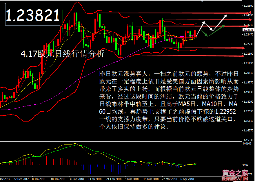 金銀同道:4.17歐元,你方唱罷我登臺,敘利亞局勢暫緩美聯(lián)儲又講話 市場消息: 周一(4月16日),敘利亞危機并未驚擾市場,避險資產黃金和日元小幅波動;美元則因晚間4月紐約聯(lián)儲制造業(yè)報告不及預期和特朗普推特指責中俄而承壓下行,歐磅等非美貨幣有所走高。周二早間澳洲聯(lián)儲會議紀要和中國一季度GDP報告雙雙出爐,晚間兩位美聯(lián)儲官員亮相,美日峰會也將在今日拉開序幕。 美元指數(shù)昨日持續(xù)下挫,隔夜最低跌至89.395,日內跌0.41%,報89.424。鑒于特朗普關于貨幣貶值的言論和敘利亞局勢緩和,投資者重燃對股票及其他風險資產的偏好,減少了避險貨幣美元的持倉。非美貨幣普漲,其中英鎊周一升穿1.43美元,逼近英國脫歐公投后的高位,因投資者關注焦點從英國對敘利亞的軍事干預轉向經(jīng)濟數(shù)據(jù),這些數(shù)據(jù)可能加強5月加息預期。 技術分析: 昨日歐元漲勢喜人,一掃之前歐元的頹勢,不過昨日歐元在一定程度上依舊是受美國方面因素所影響從而帶來了多頭的上揚。而根據(jù)當前歐元日線整體的走勢來看,經(jīng)過這段時間的糾結,歐元當前的價格致力于日線布林帶中軌至上,且高于MA5日、MA10日、MA60日均線,再趨勢上支撐了之前虛假下探的1.22952一線的支撐力度帶,只要當前價格不跌破這道關口,個人依舊保持做多的建議。 今日晚間有美聯(lián)儲高級官員的講話,是否呈現(xiàn)鷹派的言論,或者繼續(xù)延續(xù)鴿派的言論,都將是對整個金融市場都會帶來一定的影響。 操作建議: 今日歐元整體注上方1.24111一線關口,如果白盤歐元漲破1.24111一線,回調1.23800-1.23900一線介入多單,止損1.23542,上看1.24238-1.24524。 如果白盤歐元的交投比較清淡,未能突破1.24000關口,那么今日操作依舊保持回調做多為主。關注1.23324-1.23425一線做多,有1.23242加倉,統(tǒng)一止損1.22952,上看1.23878-1.23947,破位1.24000繼續(xù)上看1.24111。 【今日重點關注的財經(jīng)數(shù)據(jù)與事件】2018年4月17日 周二 ① 09:30 澳洲聯(lián)儲公布4月貨幣政策會議紀要 ② 10:00 中國第一季度GDP年率、國新辦舉行新聞發(fā)布會介紹3月國民經(jīng)濟運行情況 ③ 16:30 英國3月失業(yè)率、英國3月失業(yè)金申請人數(shù)、英國2月三個月ILO失業(yè)率 ④ 17:00 德國4月ZEW經(jīng)濟景氣指數(shù)、歐元區(qū)4月ZEW經(jīng)濟景氣指數(shù) ⑤ 20:30 美國3月新屋開工總數(shù)年化、美國3月營建許可總數(shù) ⑥ 21:15 美國3月工業(yè)產出月率、美聯(lián)儲2018年FOMC票委威廉姆斯發(fā)表演講 ⑦ 22:00 FOMC永久票委、美聯(lián)儲理事夸爾斯在眾議院金融服務委員會作證詞 ⑧ 次日04:30 美國至4月13日當周API原油庫存 ⑨ 次日05:40 美聯(lián)儲2018年FOMC票委博斯蒂克在彭博活動上就經(jīng)濟狀況發(fā)表講話 文/金銀同道 |