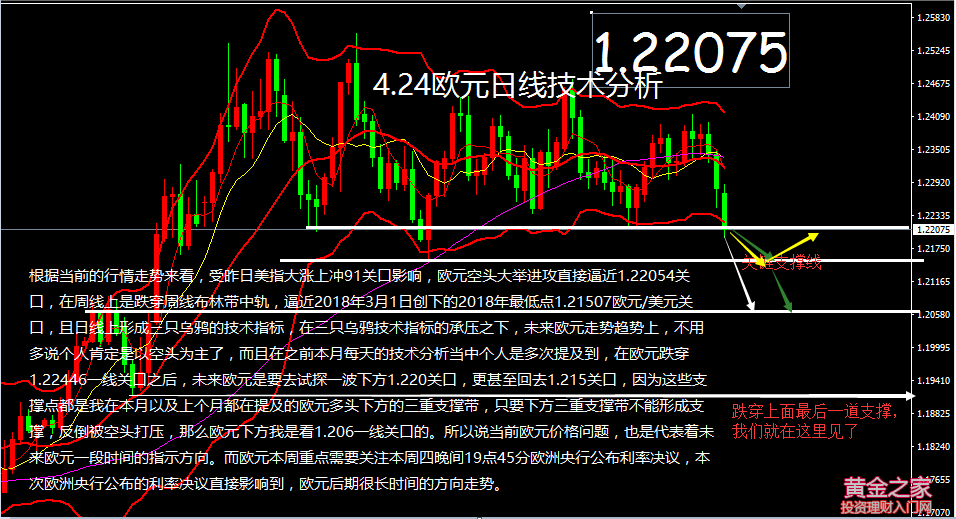 金銀同道:4.24,美指流金鑠石,歐元烏云遮天 消息解讀: 周一因美債收益率進一步上漲,而且美國經濟數據亮眼,美元指數因而橫掃整個市場,一度突破91關口,為1月18日以來新高,收漲0.67%,報90.92。CFTC最新數據顯示,市場為美元進一步走軟布倉,這可能會導致空頭頭寸出現擠壓。 歐元兌美元日內一度跌破1.22關口,收跌0.65%,報1.2206。10年期德債、美債利差擴大至236個基點,為29年新高,利差拉大或令歐元面臨風險。歐元區及主要國家昨日公布了制造業PMI數據,盡管德法兩國數據總體略有好轉,但歐元區4月制造業PMI初值僅錄得56,為14個月低點,有拉低GDP的可能性。本周歐元區的一大關鍵是歐洲央行利率決議。 技術分析: 根據當前的行情走勢來看,受昨日美指大漲上沖91關口影響,歐元空頭大舉進攻直接逼近1.22054關口,在周線上是跌穿周線布林帶中軌,逼近2018年3月1日創下的2018年最低點1.21507歐元/美元關口,且日線上形成三只烏鴉的技術指標,在三只烏鴉技術指標的承壓之下,未來歐元走勢趨勢上,不用多說個人肯定是以空頭為主了,而且在之前本月每天的技術分析當中個人是多次提及到,在歐元跌穿1.22446一線關口之后,未來歐元是要去試探一波下方1.220關口,更甚至回去1.215關口,因為這些支撐點都是我在本月以及上個月都在提及的歐元多頭下方的三重支撐帶,只要下方三重支撐帶不能形成支撐,反倒被空頭打壓,那么歐元下方我是看1.206一線關口的。所以說當前歐元價格問題,也是代表著未來歐元一段時間的指示方向。而歐元本周重點需要關注本周四晚間19點45分歐洲央行公布利率決議,本次歐洲央行公布的利率決議直接影響到,歐元后期很長時間的方向走勢。 操作建議: 1.早間歐元繼續延續空頭跌破1.220關口,可以輕倉順勢跟進空單,下看1.217歐/美-1.216歐/美,止損放在1.224一線。 2.歐元反彈1.224-1.226一線可以介入空單,止損昨日高點1.228871,下看1.220一線關口。 3.如果美盤歐元跌破1.215一線關口,可以跟進空單,看中短線至1.206一線,止損放在1.220上方。 【今日重點關注的財經數據與事件】2018年4月24日 周二 ① 09:30 澳大利亞第一季度CPI年率 ② 14:00 瑞士3月貿易帳 ③ 16:00 德國4月IFO商業景氣指數 ④ 18:00 英國4月CBI工業訂單差值 ⑤ 21:00 美國2月FHFA房價指數月率、美國2月S&P/CS20座大城市房價指數年率 ⑥ 22:00 美國3月新屋銷售總數年化、4月諮商會消費者信心指數、4月里奇蒙德聯儲制造業指數 ⑦ 次日02:00 英國央行行長卡尼在倫敦職業經濟學家協會年度晚宴上發表演講 ⑧ 次日04:30 美國至4月20日當周API原油庫存 文/金銀同道 |