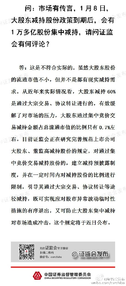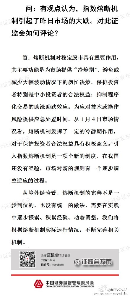 周二盤前,證監會緊急回應熔斷機制和減持禁令,證監會稱熔斷機制對穩定股市具有重要作用,將根據熔斷機制實際運行情況,不斷完善相關機制;正在研究完善規范上市公司大股東、董監高減持股份的規定。詳細情況如下: |