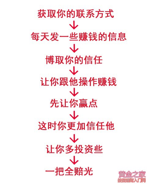 炒黃金騙局流程圖 炒黃金騙局有分兩種 第一種:冒充別人的公司,沒有任何的黃金交易資質的,比如有一家黃金平臺叫張三黃金投資,這些不法份子就會建一個官網,網址和他們接近,差一個字母或數據,也叫張三黃金投資公司,有的客戶不知道如何區分的就會在它們網站進行開戶充錢,然后讓你下載交易軟件,這些交易軟件也是他們自己開發的掌控權在他們手上,如果你贏了太多錢,有可有就不會給你提現了,調你帳號里面的數據延遲時間等。